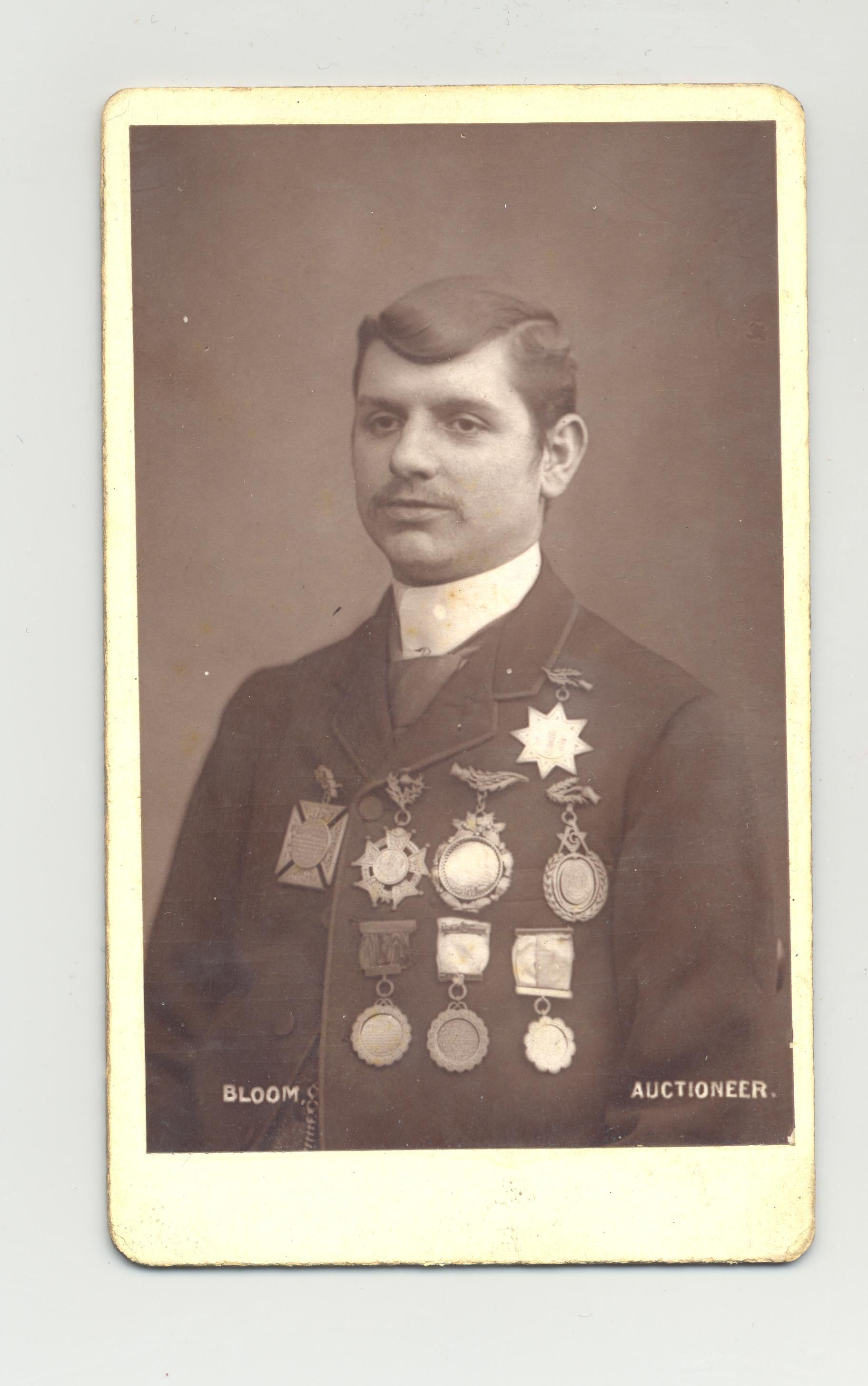 PHOTO MOUNTED ON CARDBOARD. B/W MAN W/MEDALS, "BLOOM…. AUCTIONEER" 2 1/2" X 4"