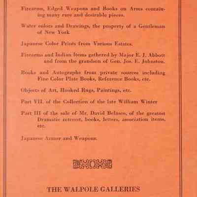 CAT, WEAPONS, 1927, NY. THE WALPOLE GALLERIES, INDIAN RELICS, FIREARMS, SOUTH SEA ISLAND PIECES, EDGED WEAPONS, BOOKS ON ARMS. B/W PHOTOS, 56 PP. 6" X 9"Created By