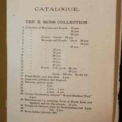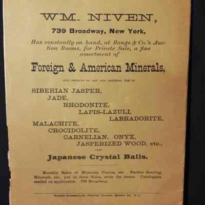CAT, ARCHEOLOGICAL & ART, 1888, NY. WM. NIVEN'S 15TH SALE MINERALS, INDIAN RELICS, FOSSILS, BOTANICAL SPECIMENS, AFRICAN WAR IMPLEMENTS, PAINTINGS, CURIOS, ETC. BANGS & CO, AUCTIONEERS. 16 PP. 6" X 9"Created By