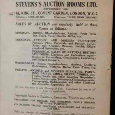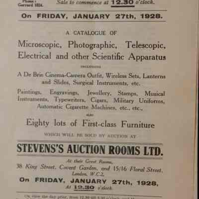 CAT, ANTIQUES, 1928, LONDON, ENGLAND. SCIENTIFIC INSTRUMENTS, FURNITURE, COLLECTIBLES. STEVENS'S AUCTION ROOMS LTD. 18 PP. 5 1/2" X 8 1/2"Created By
