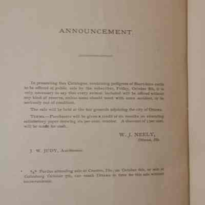 CAT, CATTLE, 1875, IL. GREENBUSH HERD, PUBLIC SALE OF SHORT HORNS. COL. J.W. JUDY, AUCTIONEER. 19 PP. 6" X 9"Created By