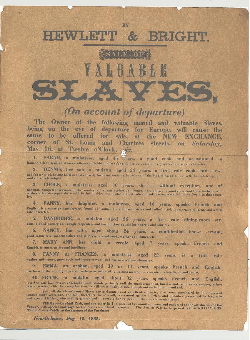 BROADSIDE, SLAVE, 1835, LA. BY HEWLETT & BRIGHT SALE OF VALUABLE SLAVES. 10 LISTED. DOC ACCOMPANIED BY LETTER OF AUTHENTICATION DATED 1990. 8 1/2" X 11"Created By