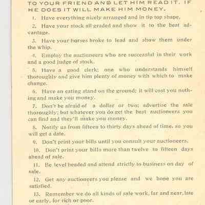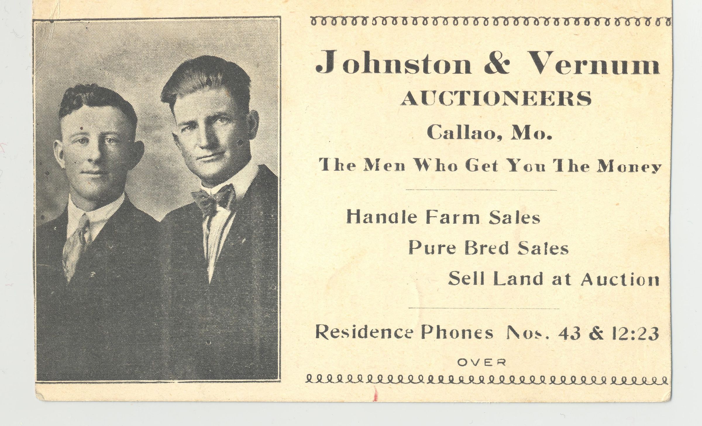 TRCD, MO. JOHNSTON & VERNUM, AUCTIONEERS "THE MEN WHO GET YOU THE MONEY". ON BACK "HOW TO PREPARE FOR A PUBLIC SALE" 5 1/4" X 4 1/2" B/W PHOTO AUCTIONEERS.Created By