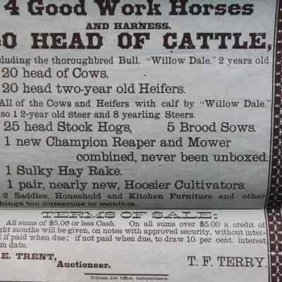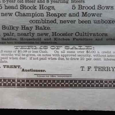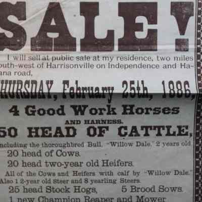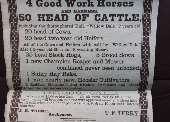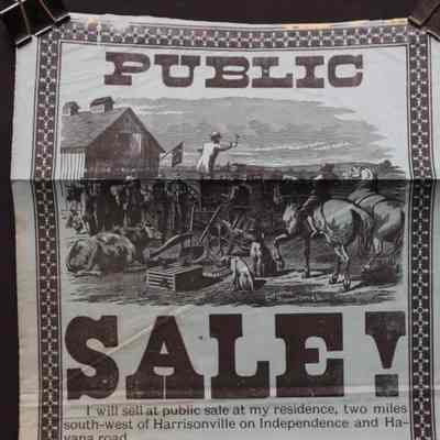 BROADSIDE, FARM, 1886, HARRISONVILLE. LIVESTOCK, EQUIPMENT, HOUSEHOLD. J.E. TRENT, AUCTIONEER. 9" X 18 1/2"Created By
