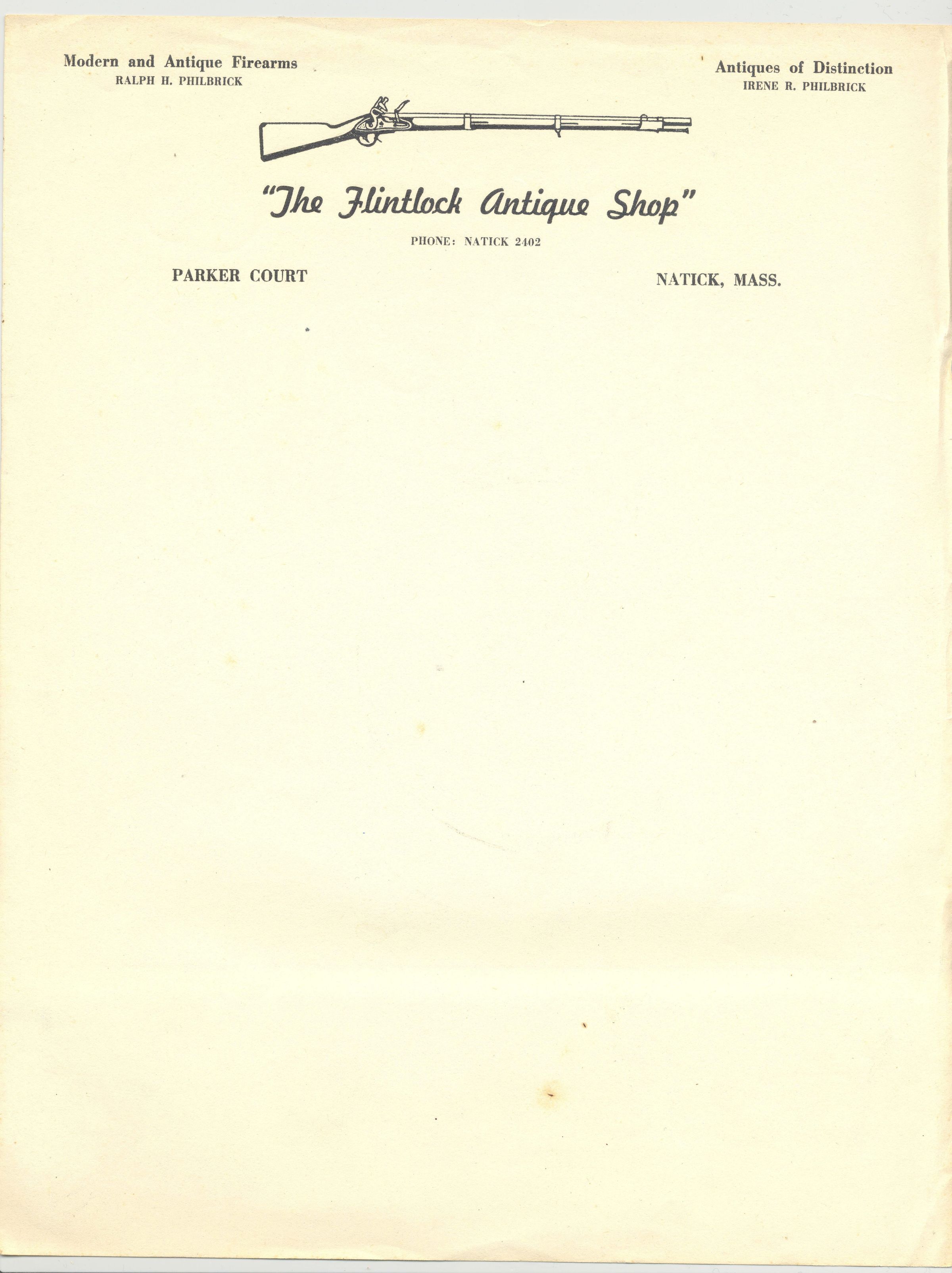 DOC, LETTERHEAD, MA. THE FLINTLOCK ANTIQUE SHOP, MODERN AND ANTIQUE FIREARMS, RALPH PHILBRICK. 8 1/2" X 11"Created By