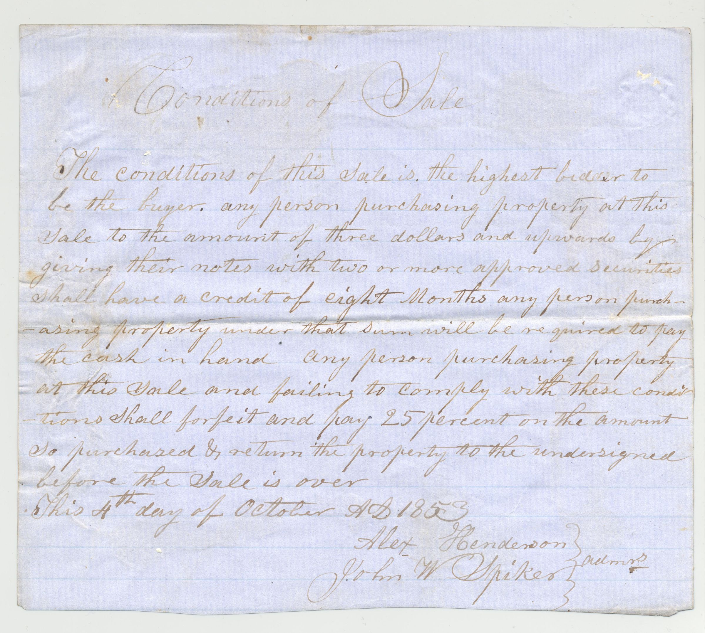 DOC, TERMS, 1853. HENDERSON & SPIKES, ADMINISTRATORS. 7 1/4" X 6 1/4"