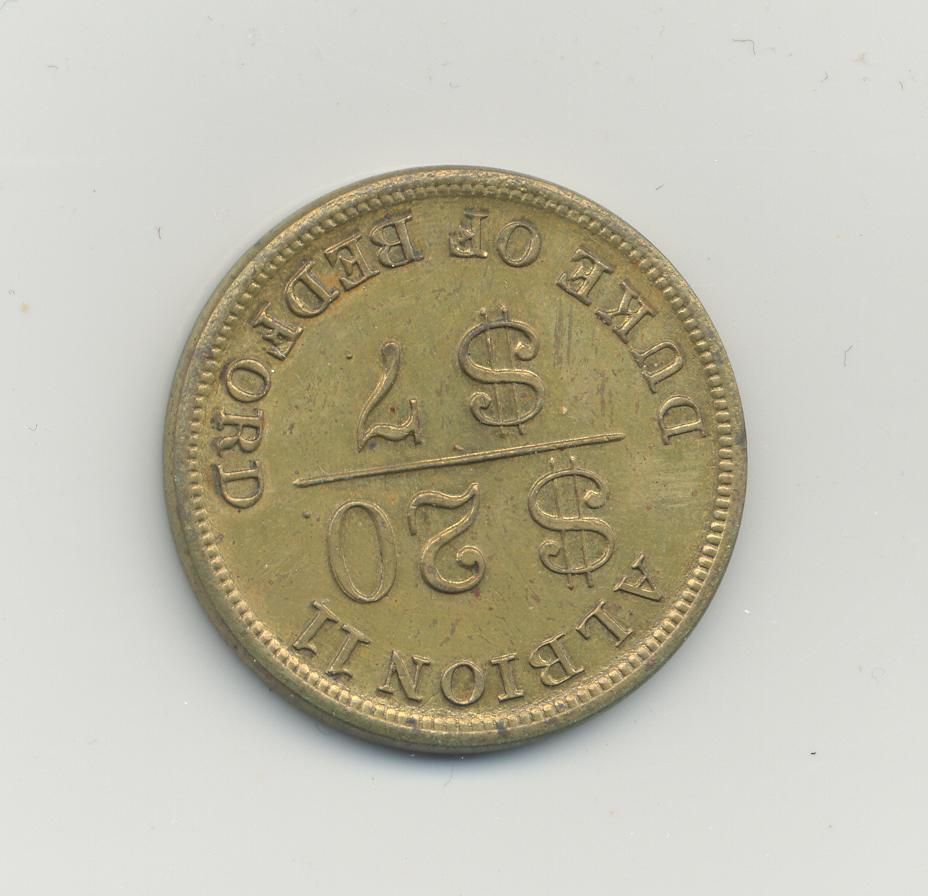 COIN, ADVERTISING, 1858. COL. HARDY CRIER, $10, BACK SIDE: ALBION 11, DUKE OF BEDFORD, $20/$7, 1" DIAMETERCreated By