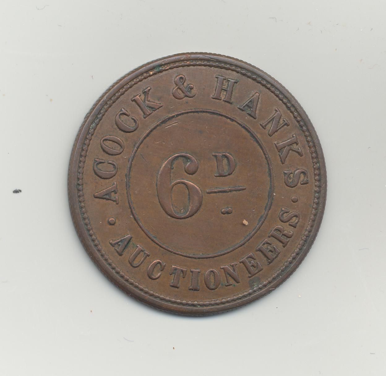 COIN, ADVERTISING, "ACOCK & HANKS, AUCTIONEERS 6D" 1 1/2" DIAMETER