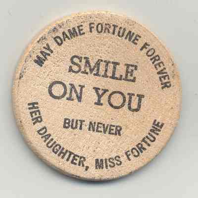 ADVERTISING TOKEN, MO, 1904. GOOD LUCK TOKEN, WORLD'S FAIR. "MAY DAME FORTUNE SMILE ON YOU BUT NEVER HER DAUGHTER MISS FORTUNE" 1 1/2" DIAMETERCreated By