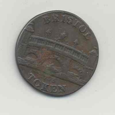 ADVERTISING COIN, 1795, BRISTOL TOKEN. SCENE OF BRIDGE ONE SIDE. OTHER SIDE TWO COLONIAL MEN, "I WANT TO BUY SOME CHEAP BARGAINS." "THEN GO TO NIBLOCK'S IN BRIDGE STREET." 1" DIAMETERCreated By