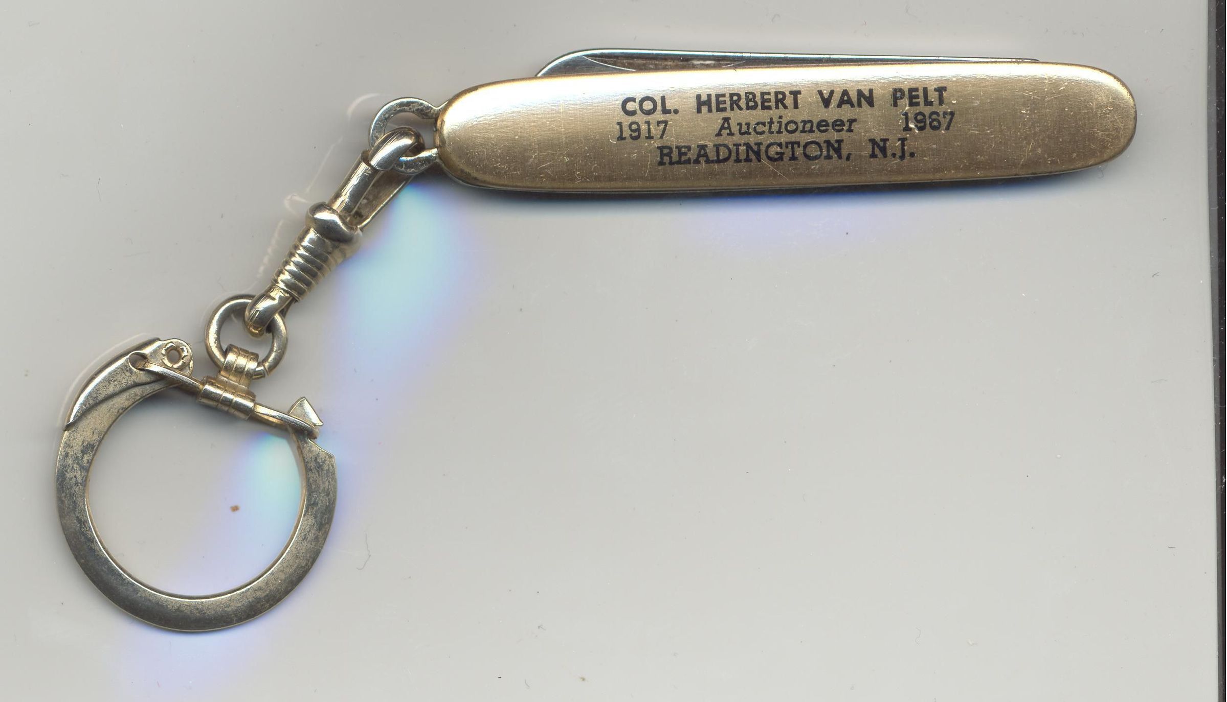 POCKETKNIFE, ADVERTISING, COL. HERBERT VAN PELT, AUCTIONEER. 1917 - 1967, READINGTON, NJ. 2 1/2" LONGCreated By