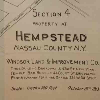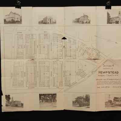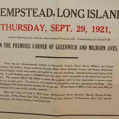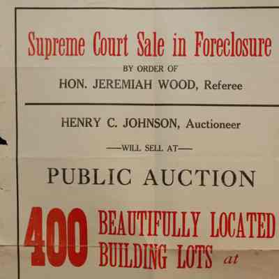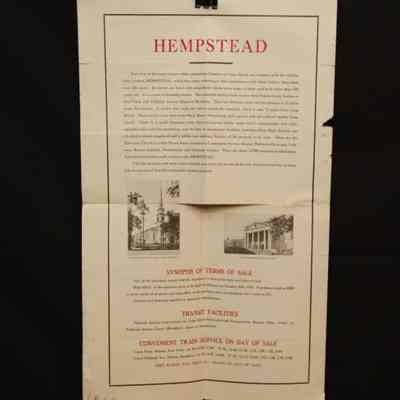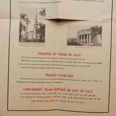 BROADSIDE AND MAP, REAL ESTATE, 1921, NY. SUPREME COURT SALE IN FORECLOSURE. HENRY JOHNSON, AUCTIONEER. 400 BLDG LOTS AT HEMPSTEAD, LONG ISLAND. MAP, PHOTOS, 14 1/2" X 22" FOLDED.Created By