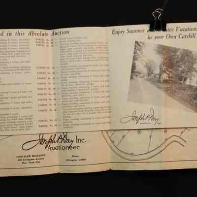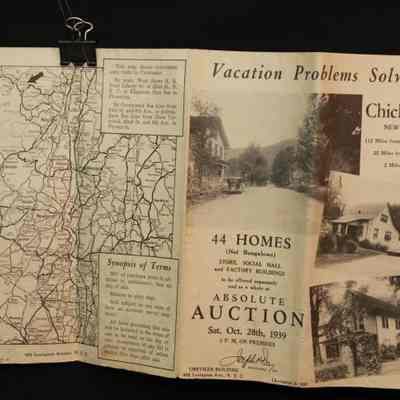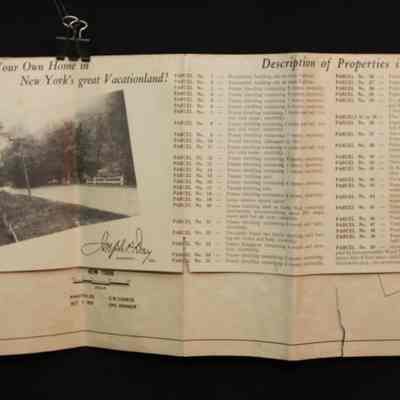 BROCHURE, MAP, REAL ESTATE, 1939, NY. "VACATION PROBLEMS SOLVED!" 44 HOMES AT ABSOLUTE AUCTION, JOSEPH DAY, AUCTIONEER. PHOTOS. 8 3/4" X 11" FOLDEDCreated By