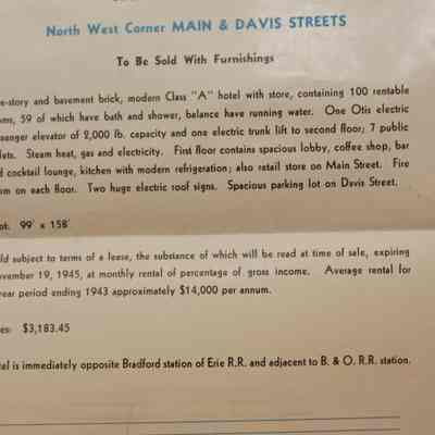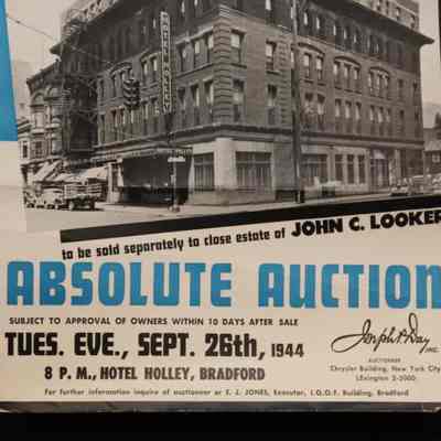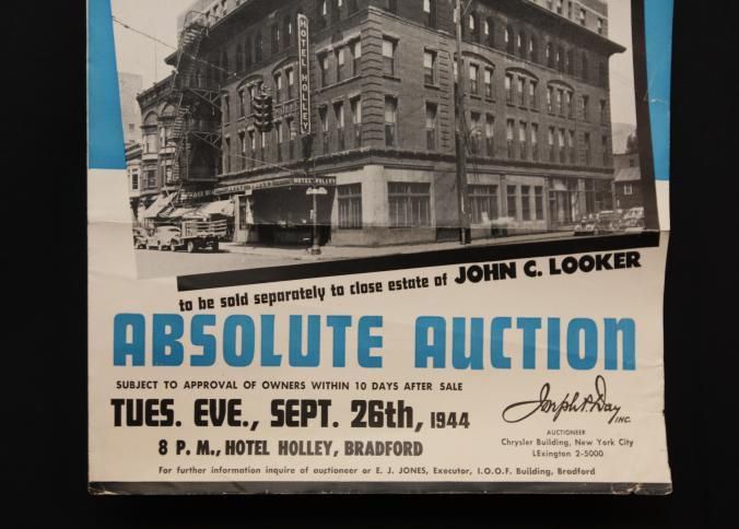 FLYER, 1944, REAL ESTATE, PA. 100 ROOM FURNISHED HOTEL, ALSO 9 BUSINESS & RESIDENTIAL PROPERTIES. ABSOLUTE AUCTION. JOSEPH DAY, AUCTIONEERS. PHOTOS, DESCRIPTIONS, TERMS. 9" X 12" FOLDEDCreated By