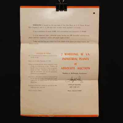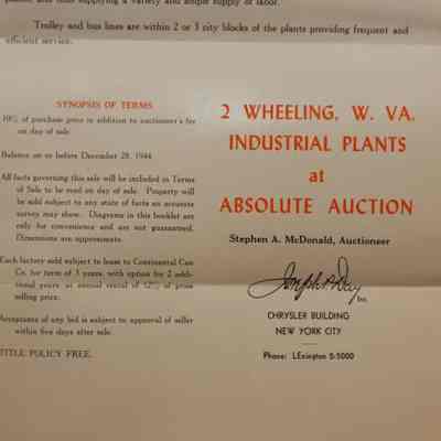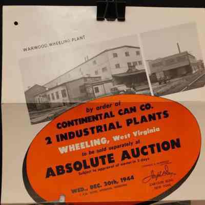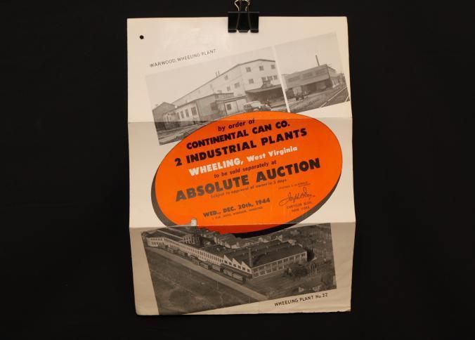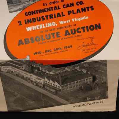 FLYER, 1944, REAL ESTATE, WV. CONTINENTAL CAN CO, 2 INDUSTRIAL PLANTS TO BE SOLD AT ABSOLUTE AUCTION. JOSEPH DAY, AUCTIONEERS. PHOTOS, TERMS, MAP. 9" X 12 FOLDEDCreated By