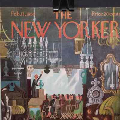 MAG COVER, THE NEW YORKER, FEB. 1956. COLOR ILLUS OF ANTIQUES AUCTION. 8 3/4" X 11 1/2"