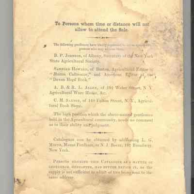 CAT, LIVESTOCK, 1856, NY. LEWIS G. MORRIS' SEVENTH CATALOGUE OF PURE BRED DOMESTIC ANIMALS TO BE SOLD AT AUCTION AT MOUNT FORDHAM, WESTCHESTER COUNTY, NY. ILLUS, 88 PP. 5 3/4" X 9"Created By