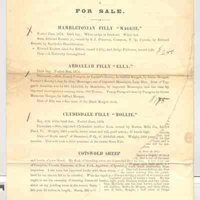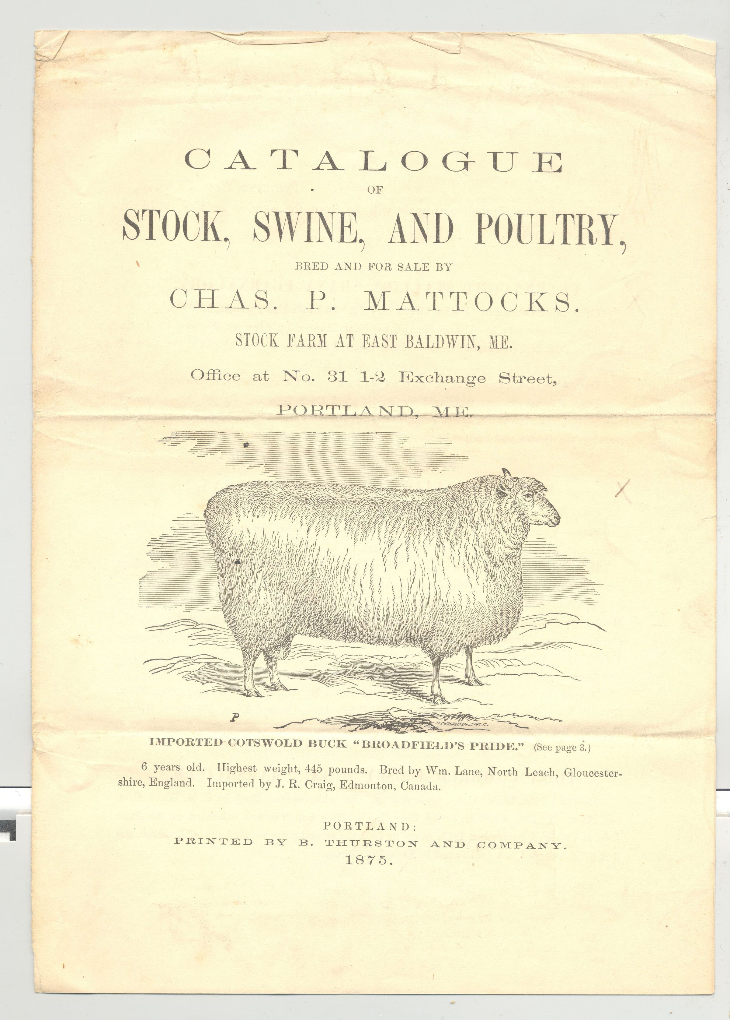 CAT, LIVESTOCK, 1875, ME. STOCK, SWINE & POULTRY BRED AND FOR SALE BY CHAS. P. MATTOCKS. PAGE MISSING. 4 PP, ILLUS OF SHEEP. 7 3/4" X 10 3/4"Created By
