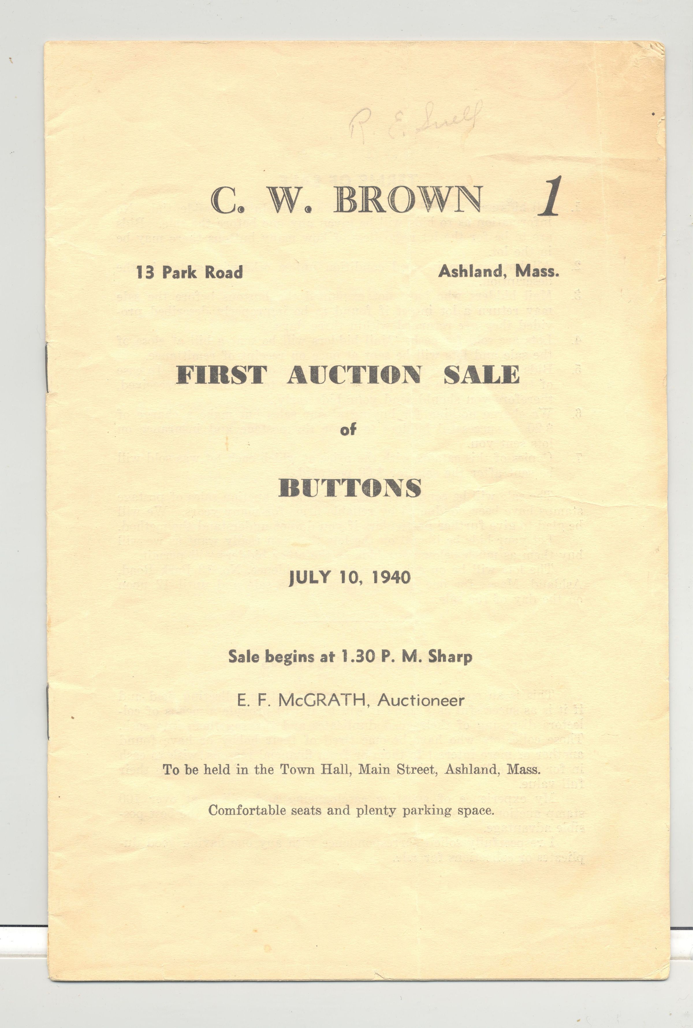 CAT, BUTTONS, 1940, MA. FIRST AUCTION SALE OF BUTTONS, E.F. MCGRATH, AUCTIONEER. 16 PP. SOME PRICES, 6" X 9"Created By