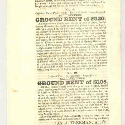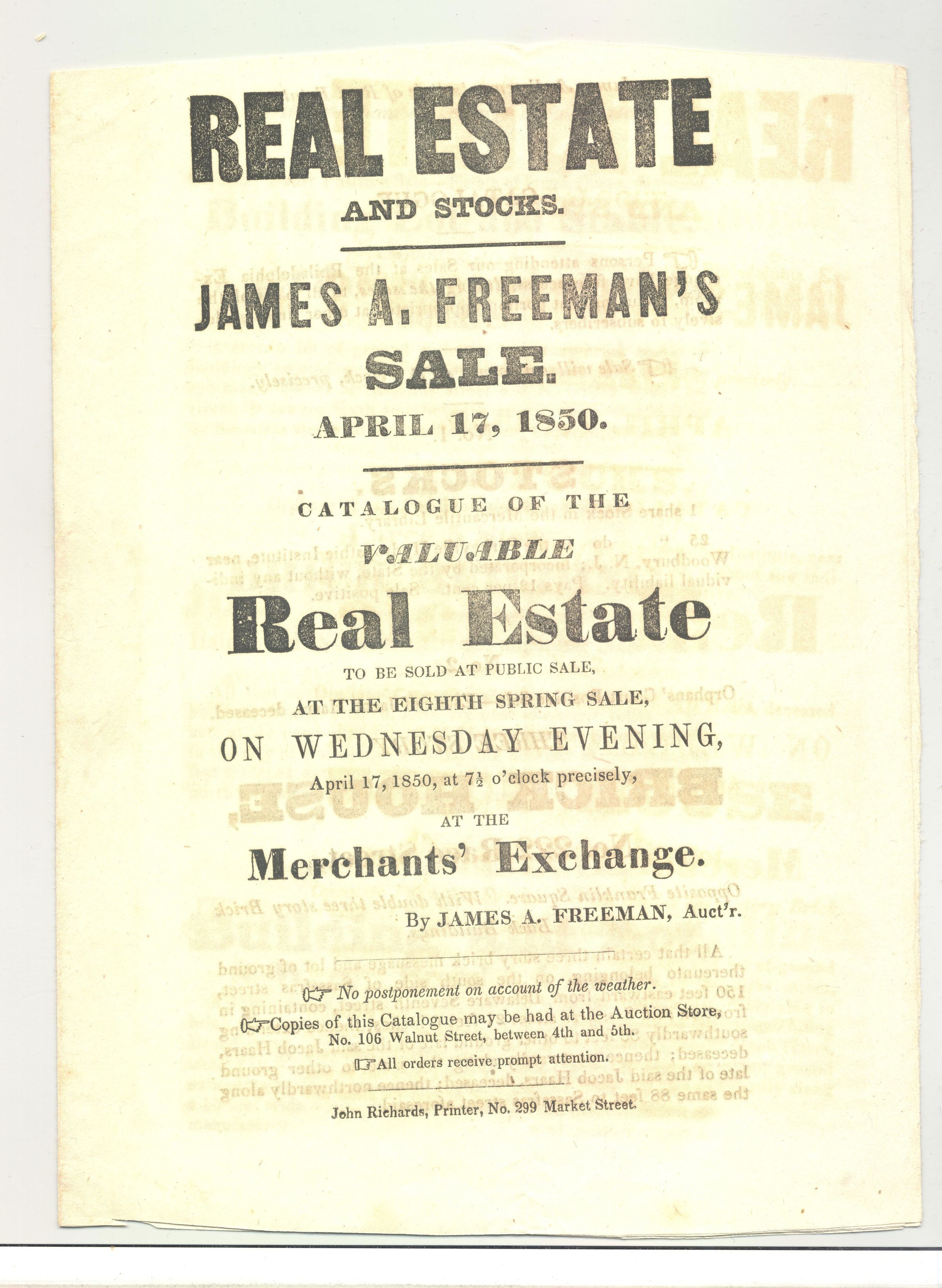 CAT, REAL ESTATE, 1850. REAL ESTATE & STOCKS. JAMES A. FREEMAN'S SALE AT THE MERCHANTS' EXCHANGE. 8 PP, 6" X 8 1/2"Created By