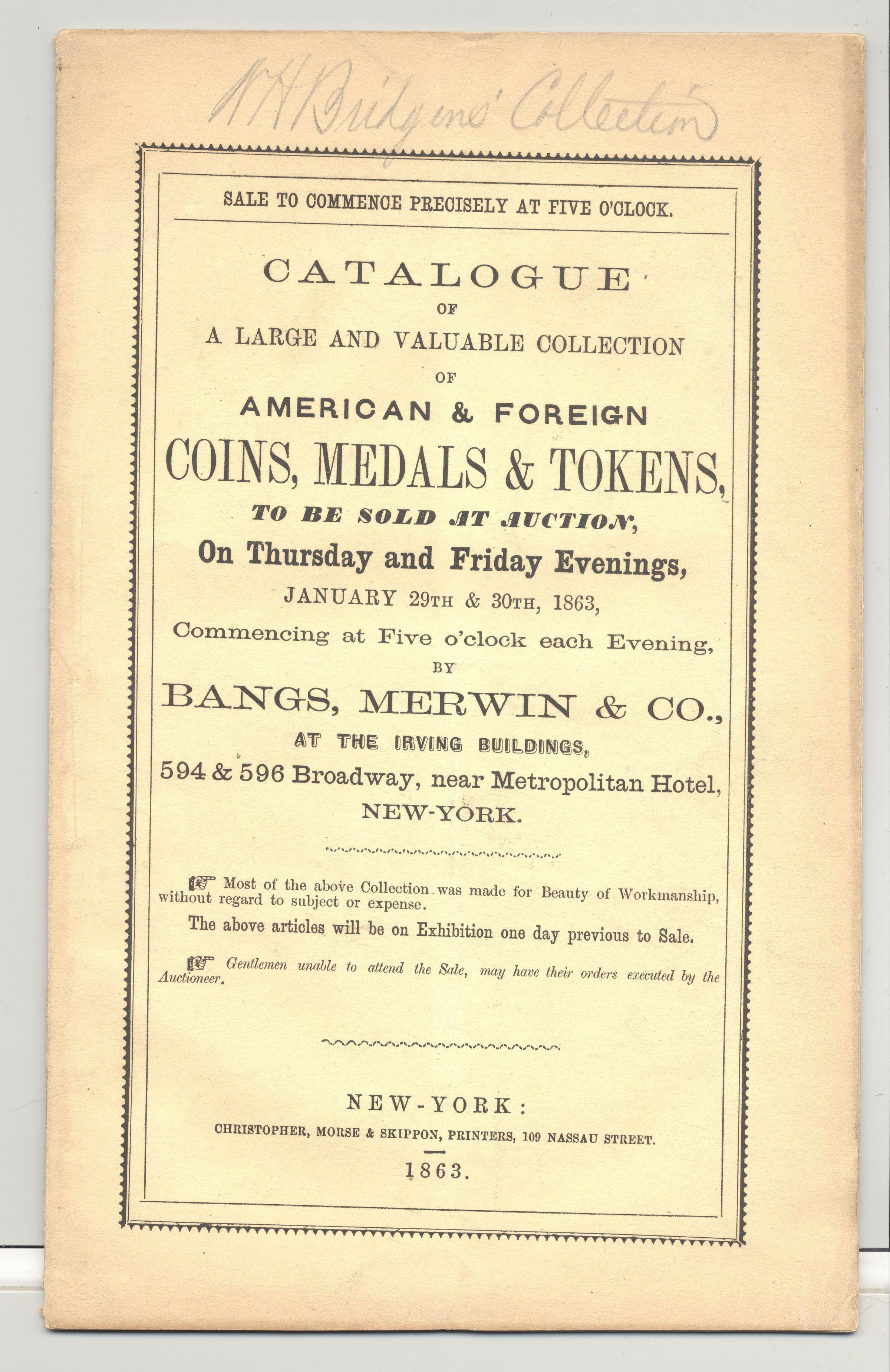 CAT, 1863, COINS, NY. BANGS, MERWIN & CO, AUCTIONEERS. 32 PP. 5 3/4" X 9"