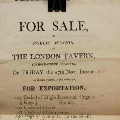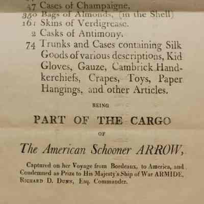 CAT, 1812, MA. PART OF THE CARGO OF THE AMERICAN SCHOONER ARROW, CAPTURED ON HER VOYAGE FROM BORDEAUX, TO AMERICA, AND CONDEMNED AS PRIZE TO HIS MAJESTY'S SHIP OF WAR "ARMIDE", RICHARD D. DUNN, ESQ. COMMANDER. 9 PP. 9 3/4" X 15"Created By