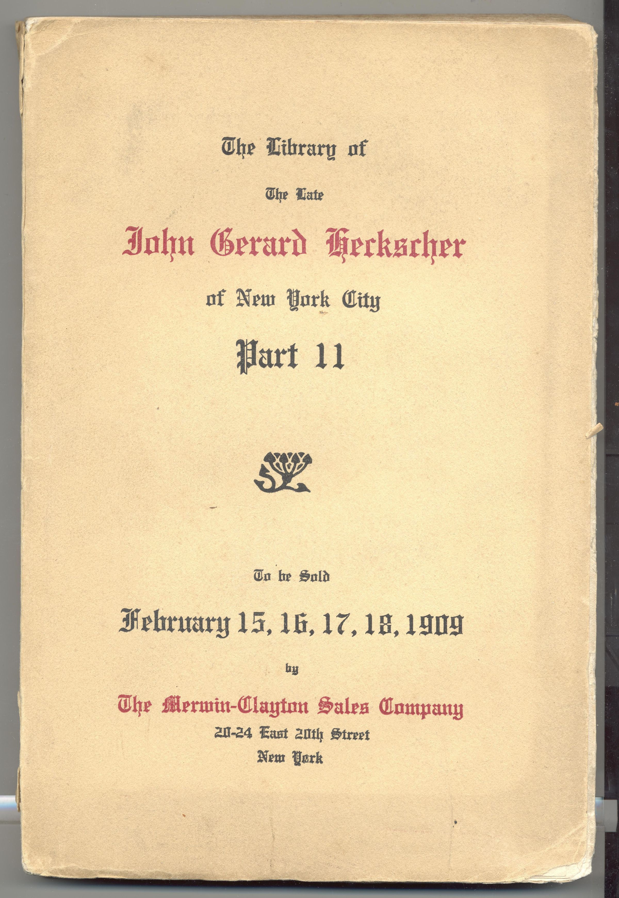 CAT, BOOKS, 1909, NY. THE LIBRARY OF THE LATE JOHN GERARD HECKSCHER OF NYC, PART II. MERWIN-CLAYTON SALES CO, AUCTIONEERS. INCL PRICE LIST. 146 PP. 6 1/2" X 9 1/2"Created By