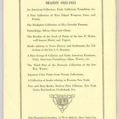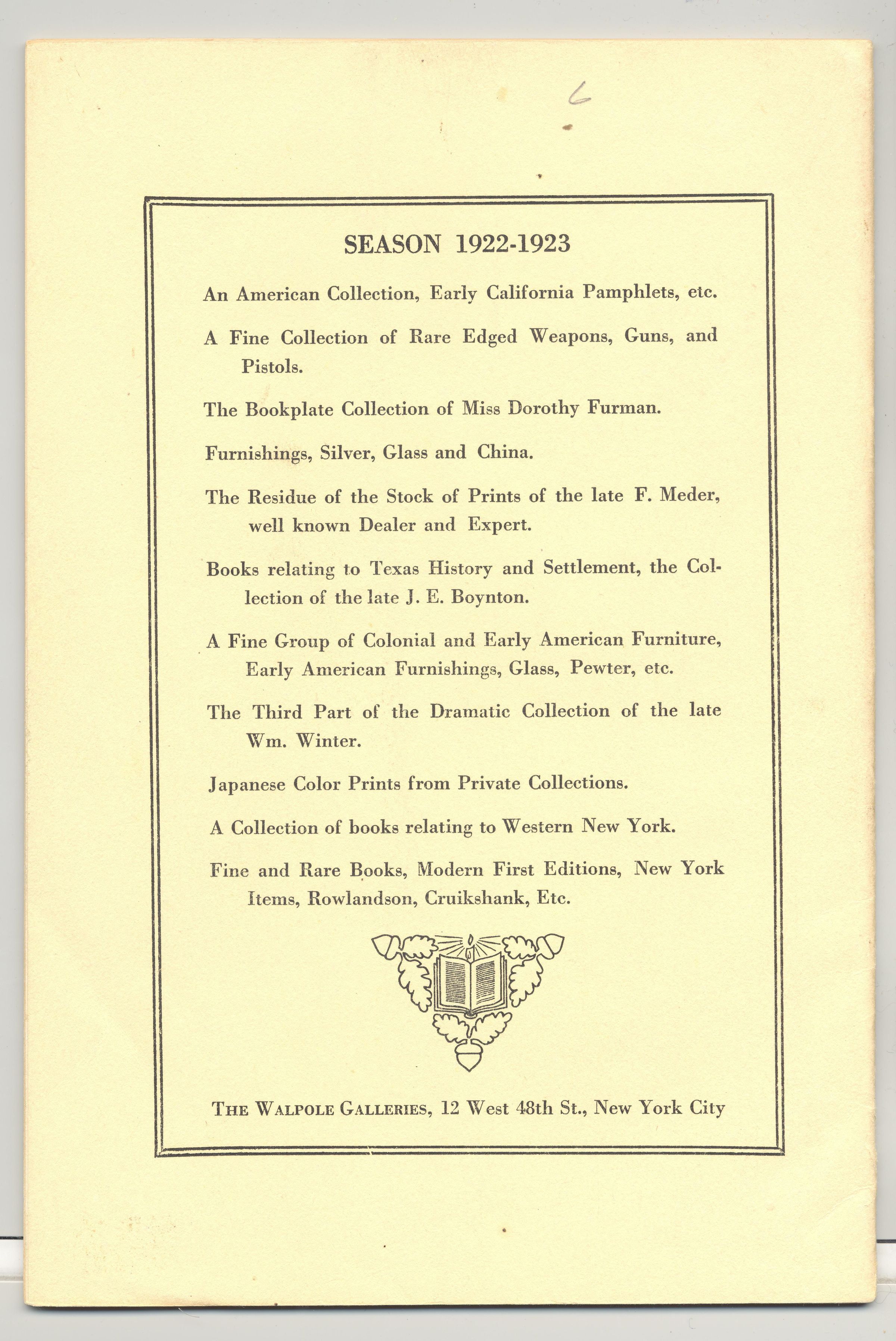 CAT, BOOKS, 1923, NY. MISCELLANEOUS BOOKS TO BE SOLD AT AUCTION BY THE WALPOLE GALLERIES. PRICED, 39 PP. 6" X 9"Created By