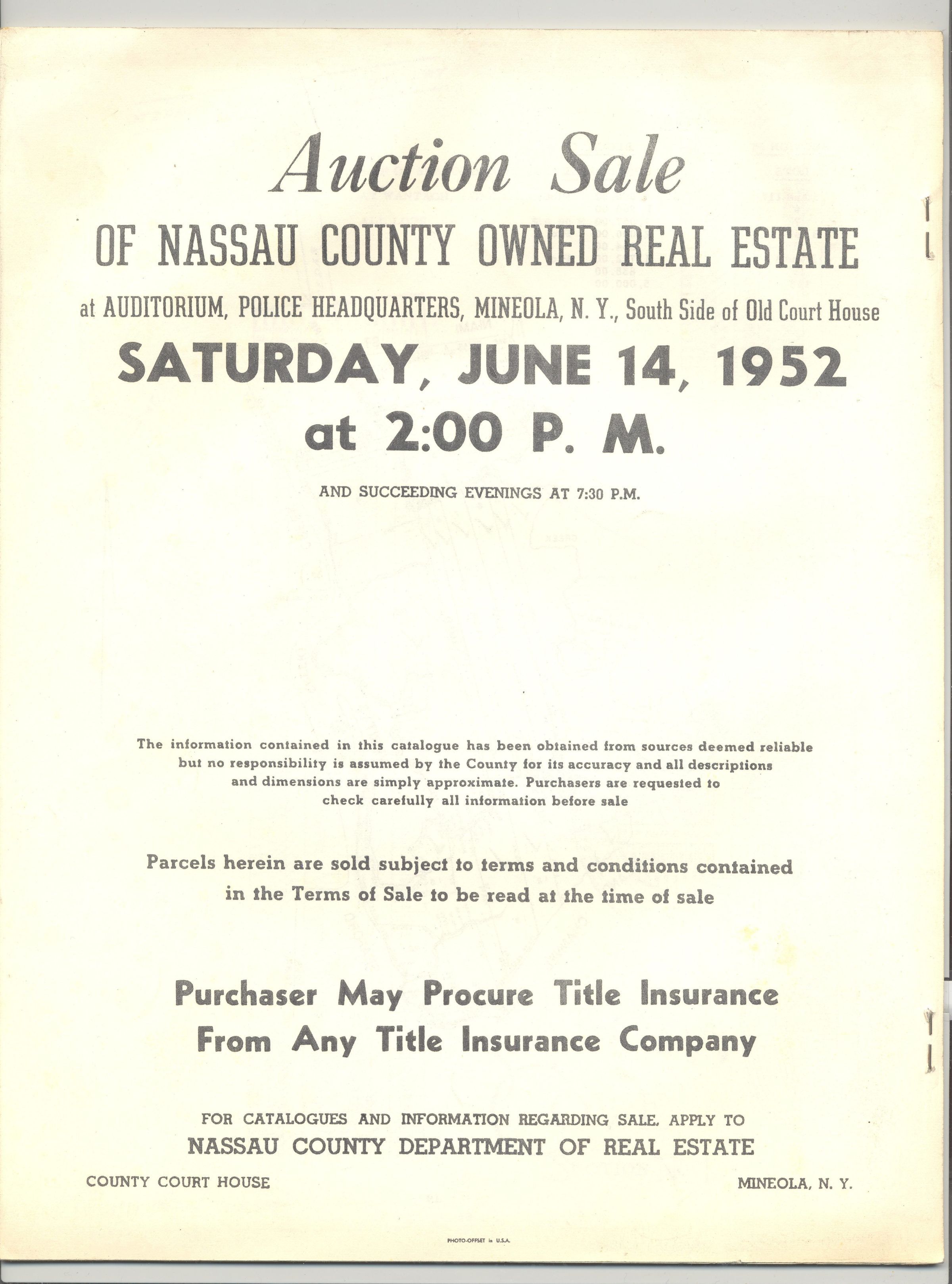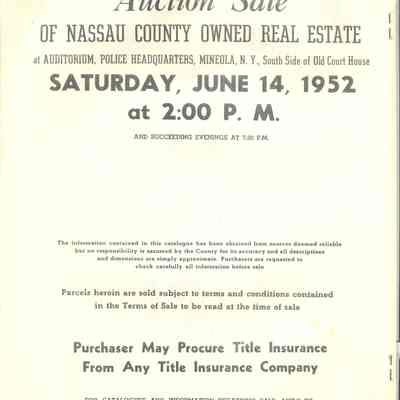 CAT, REAL ESTATE, 1952, NY. IMPROVED AND UNIMPROVED REAL ESTATE OWNED BY THE COUNTY OF NASSAU. 19 PP. ILLUS, MAP. 8 1/2" X 11"Created By
