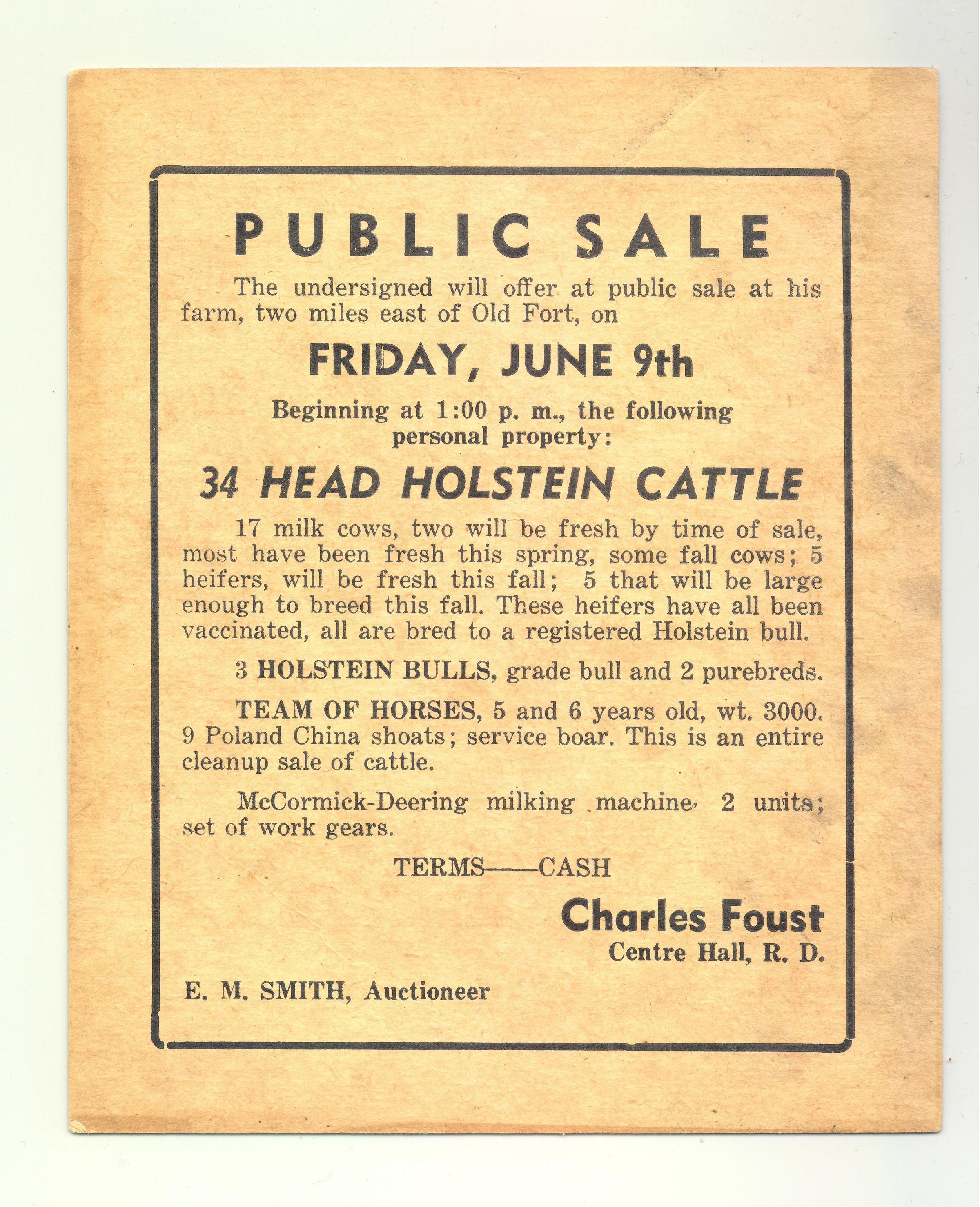 ADVERTISING CARD, LIVESTOCK, PUBLIC SALE 34 HEAD HOLSTEIN CATTLE, BULLS, HORSES. E.M. SMITH, AUCTIONEER. NO YEAR NOTED. 5" X 6"Created By