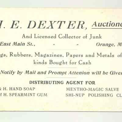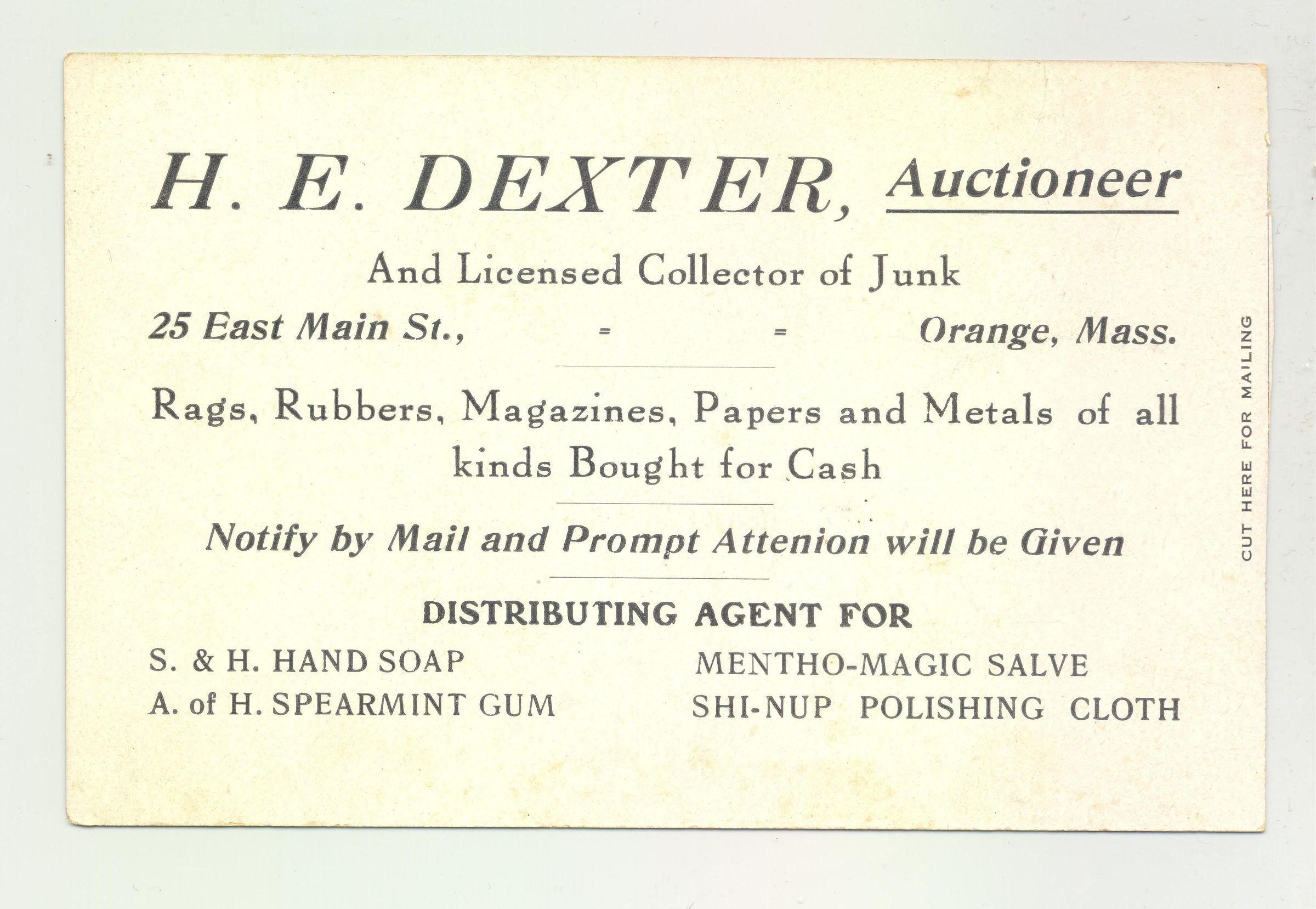 PSCD, ADVERTISING. H.E. DEXTER, AUCTIONEER AND LICENSED COLLECTOR OF JUNK. ORANGE, MA. COLORED PRINT.Created By