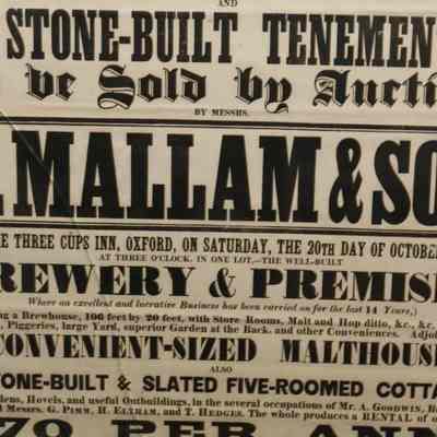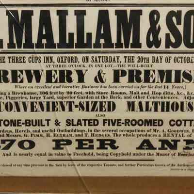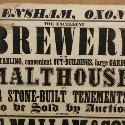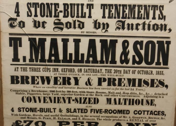 FR BROADSIDE, REAL ESTATE, 1855, OXFORD. "THE EXCELLENT BREWERY, WITH STABLING, CONVENIENT OUT-BUILDINGS, LARGE GARDEN, MALTHOUSE, AND 4 STONE BUILT TENEMENTS, TO BE SOLD BY AUCTION BY MESSRS. T. MALLAM & SON" ENGLAND. 19 1/4" X 26 1/4"Created By