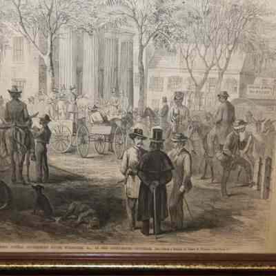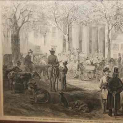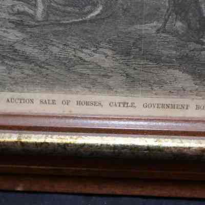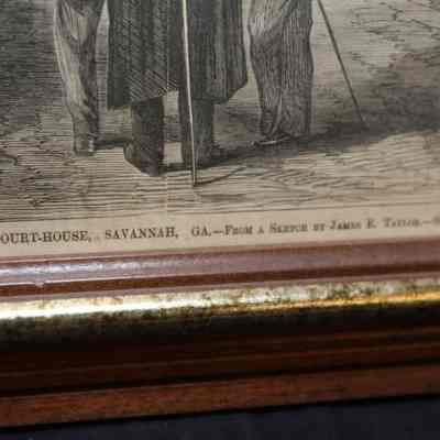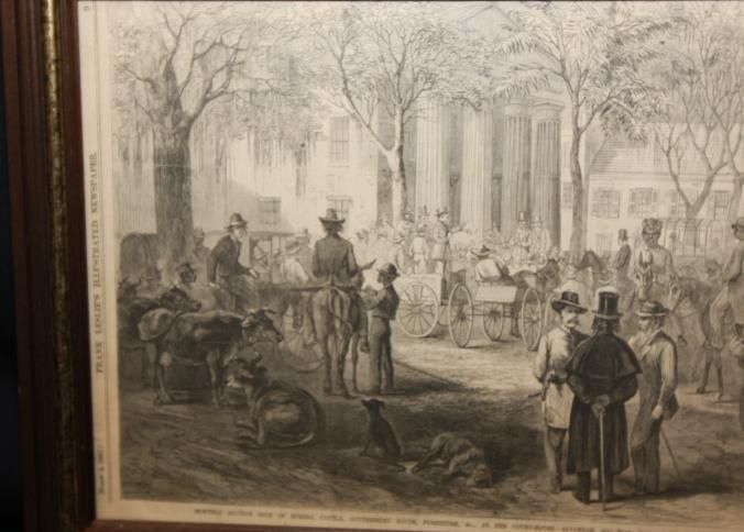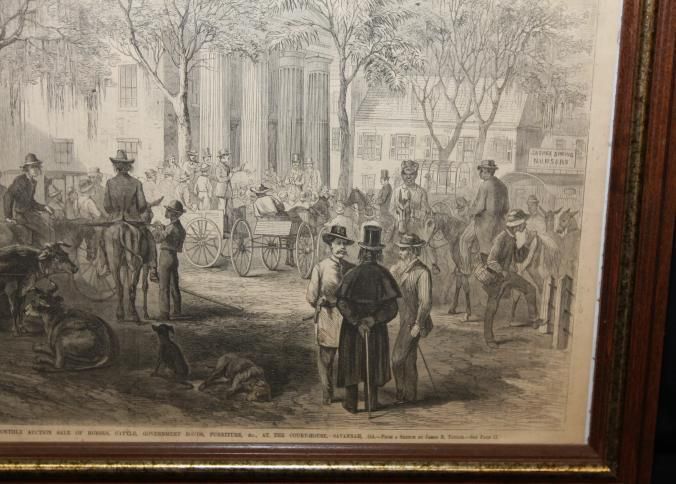 FR PRINT, 1867, FROM FRANK LESLIE'S ILLUSTRATED NEWSPAPER. "MONTHLY AUCTION SALE OF HORSES, CATTLE, GOVERNMENT BONDS, FURNITURE, ETC. AT THE COURT-HOUSE, SAVANNAH, GA - FROM A SKETCH BY JAMES E. TAYLOR" 18" X 12 3/4"Created By