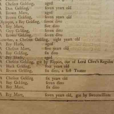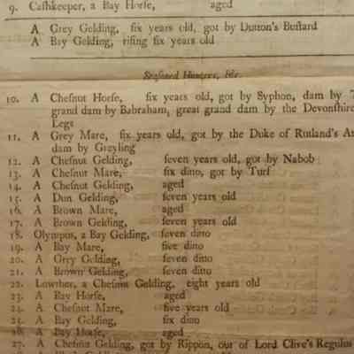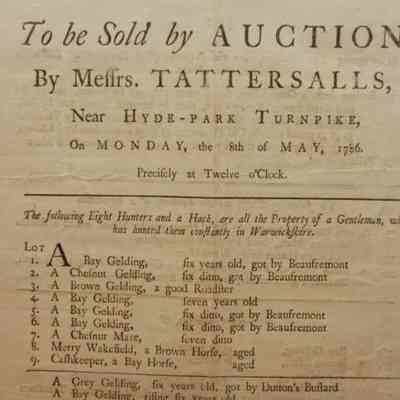 FR CAT, HORSE, 1786, ENGLAND. TO BE SOLD BY AUCTION BY MESSRS. TATTERSALLS. 10 1/2" X 20"