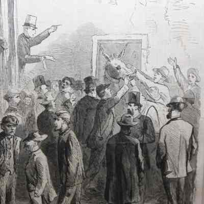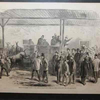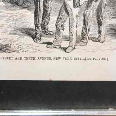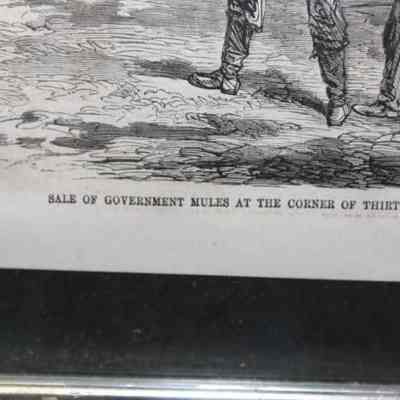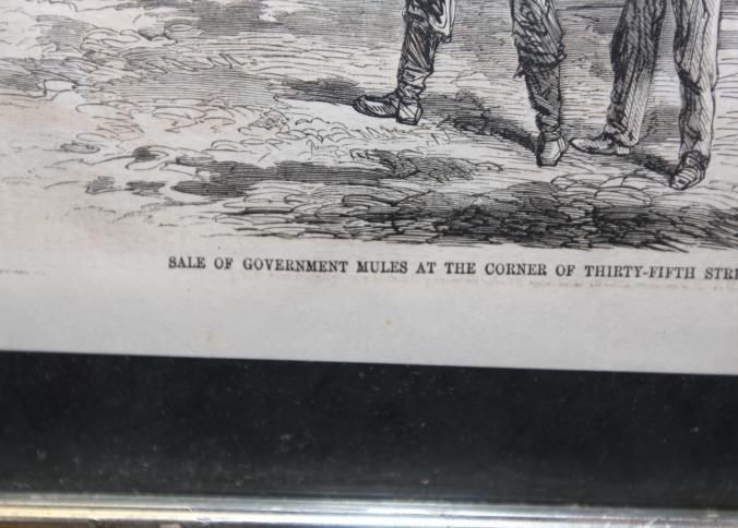 FR PRINT, 1865, NY. PRINT FROM HARPERS WEEKLY, "SALE OF GOVERNMENT MULES AT THE CORNER OF THIRTY-FIFTH STREET AND TENTH AVENUE, NEW YORK CITY. 18 3/4" X 14 1/4"Created By