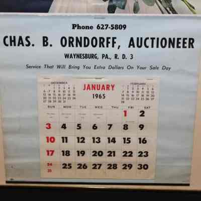 FR ADVERTISING CALENDAR, 1965, PA. CHAS. B. ORNDORFF, AUCTIONEER. "SERVICES THAT WILL BRING YOU EXTRA DOLLARS ON YOUR SALES DAY" 22" X 35"Created By