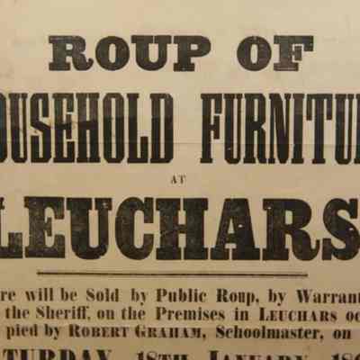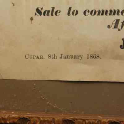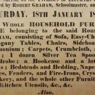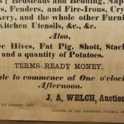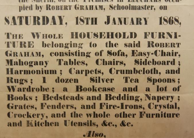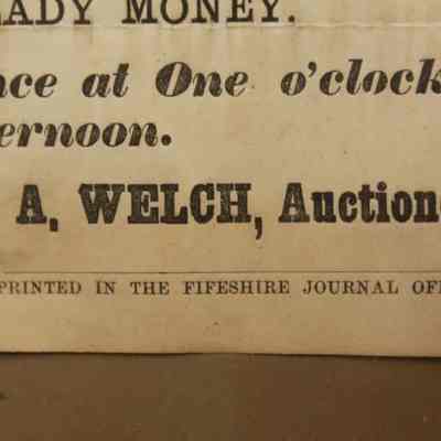 FR BROADSIDE, FURNITURE, LEUCHARS, 1868. ROUP OF HOUSEHOLD FURNITURE AT LEUCHARS. J.A. WELCH, AUCTIONEER. 16 3/4" X 20 1/4"Created By