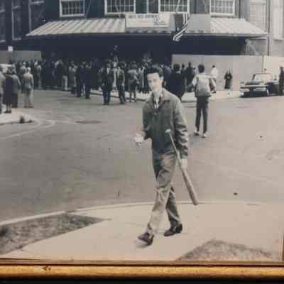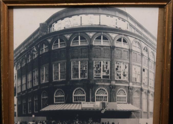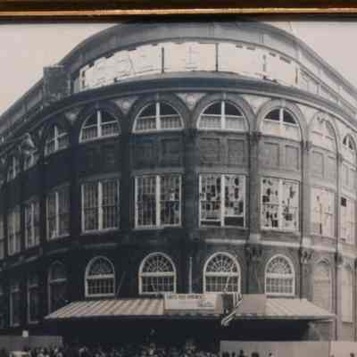 FR PHOTO, EBBETS FIELD APARTMENTS, BOY WITH BASEBALL AND BAT IN FOREGROUND. 8 1/2" X 10 1/2"