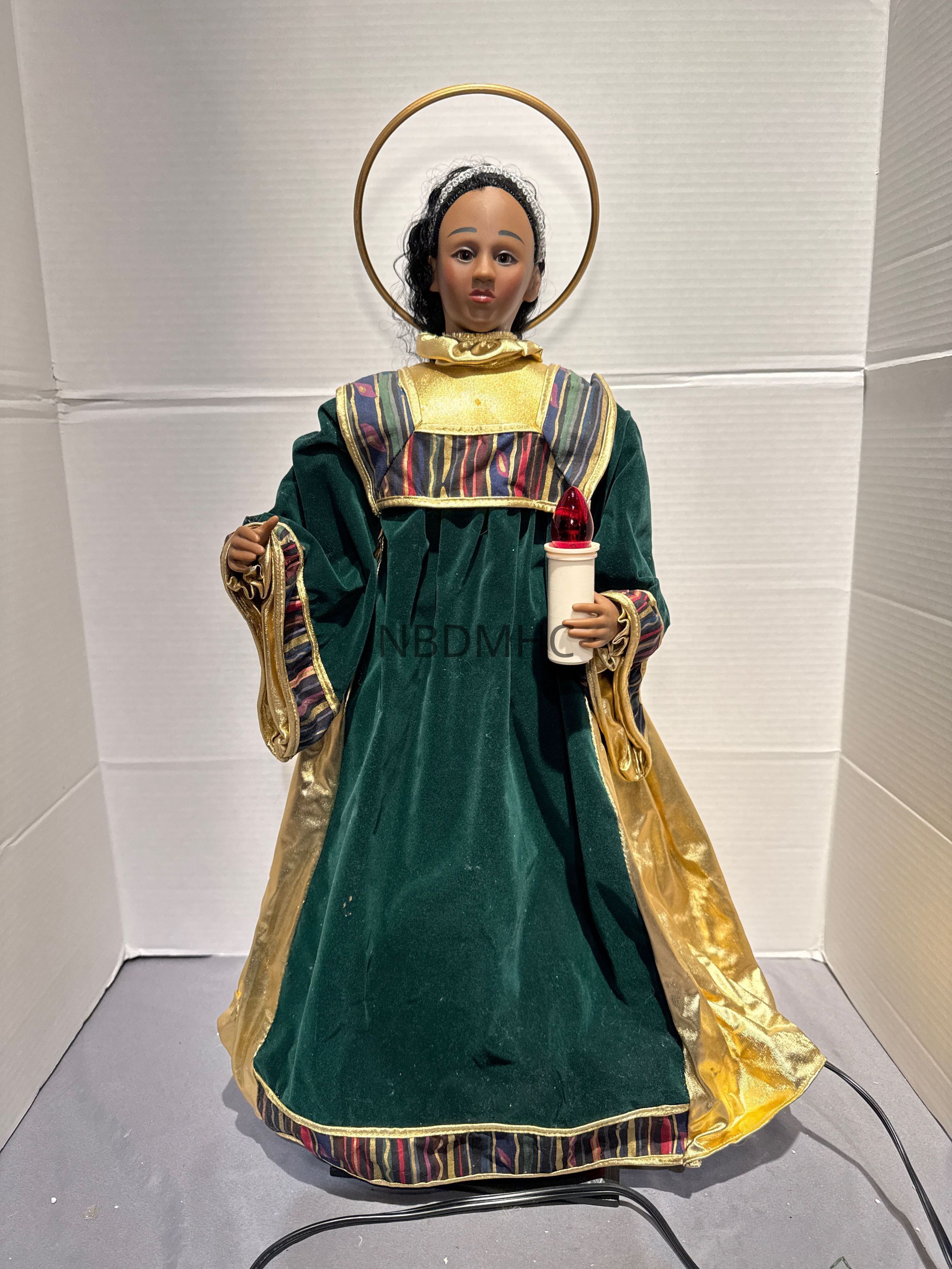 24” Motionette angel. Green velvet gown trimmed in gold. Holding a candle. Guinness 847