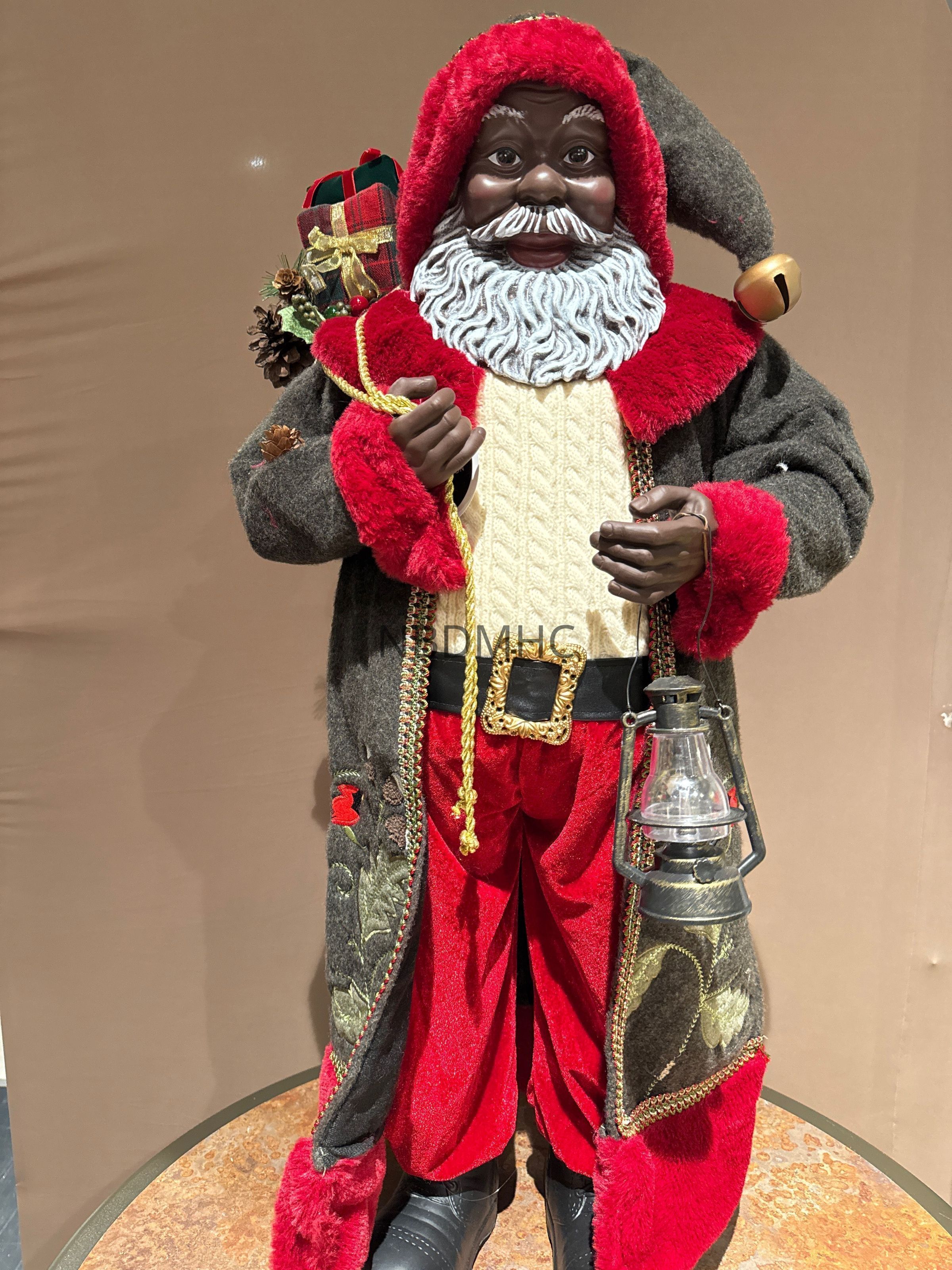 34 inch Santa with gray coat and hat, both with gold braid and red borders. Ivory knit sweater. Coat has cardinal and leaves appliqué. Holding lantern and gold rope attached to burlap gift bag. Guinness 667.