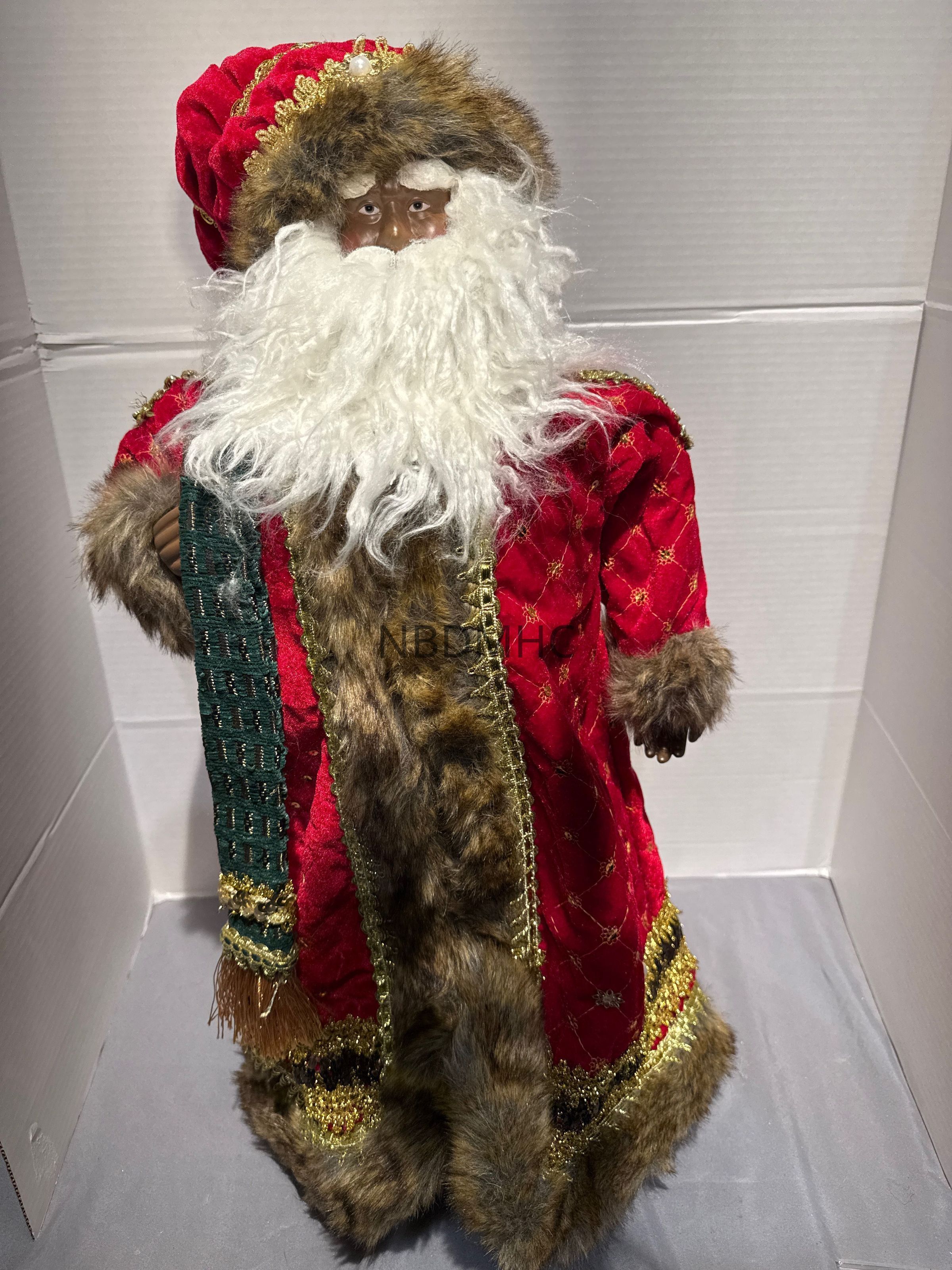 24 inch vinyl Santa wearing red hat and red quilted robe, both with brown fur and gold trim. Geeen stole has gold trim and fringe. Holding brown leather bag of greens and gifts. Brown leather shoes. Guinness 546 and 1 of 2