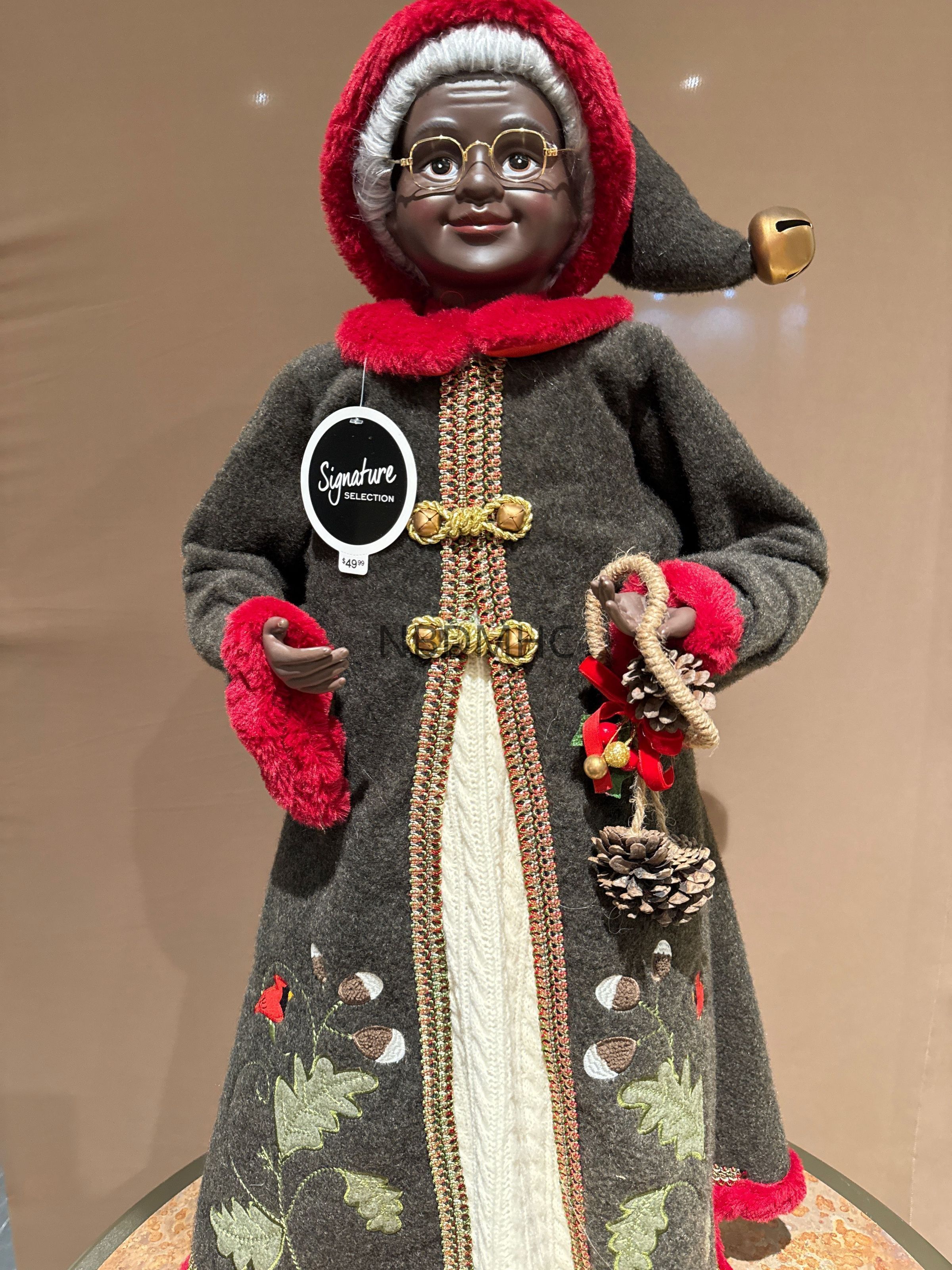 33 inch Mrs Claus wearing gray coat with gold braid and red borders. Cardinal and leaves appliqué on coat. Ivory cable knit dress. Holding pine cones. Guinness 666.