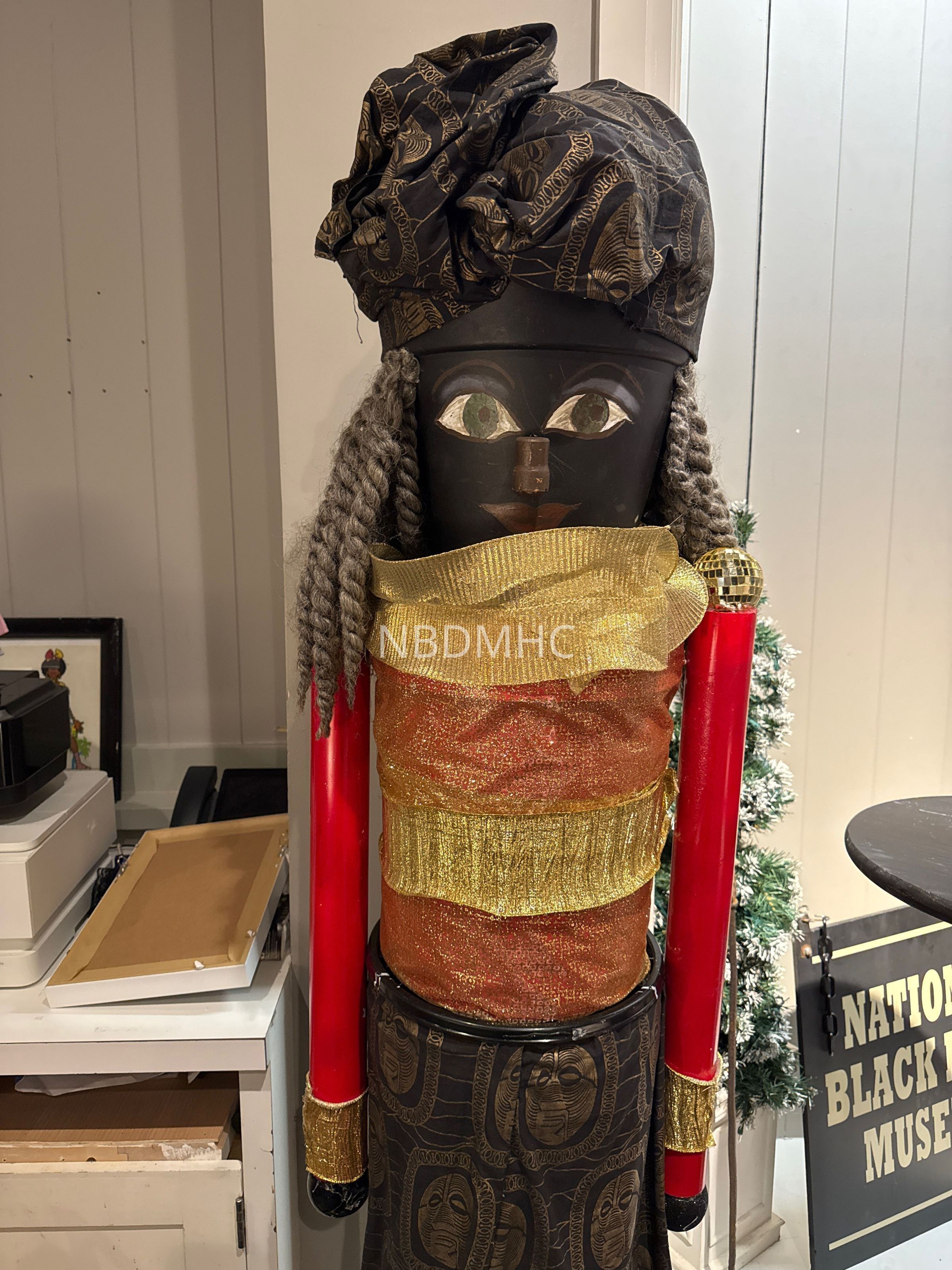 72 inch handmade nutcracker woman with black and gold headwrap, gray curled hair, orange and gold top, black and gold skirt, gold legs. Guinness 149