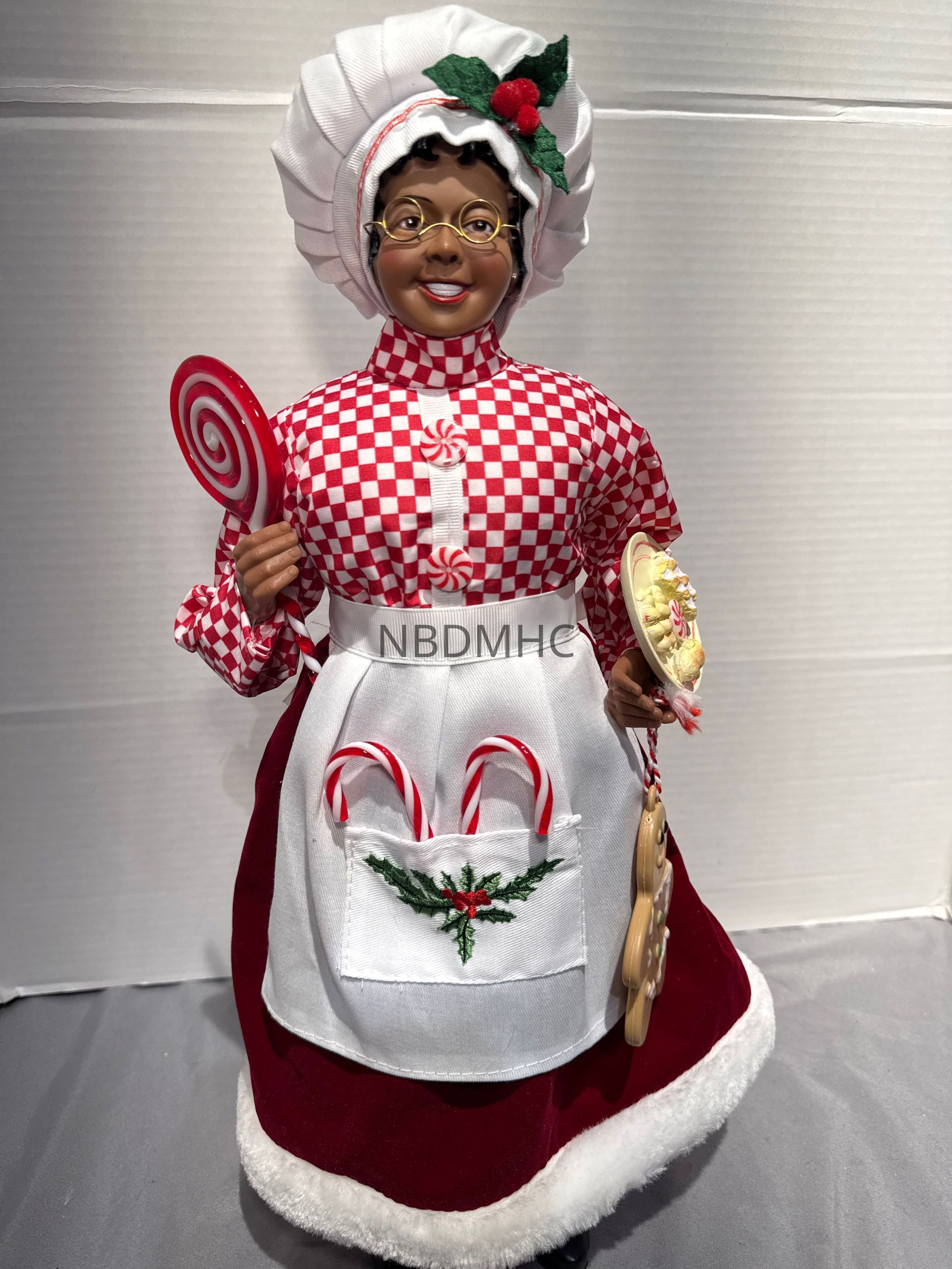 18 “ Mrs Santa Cookie Chef wearing a red & white checkered shirt with white apron holding 2 candy canes. Guinness 731