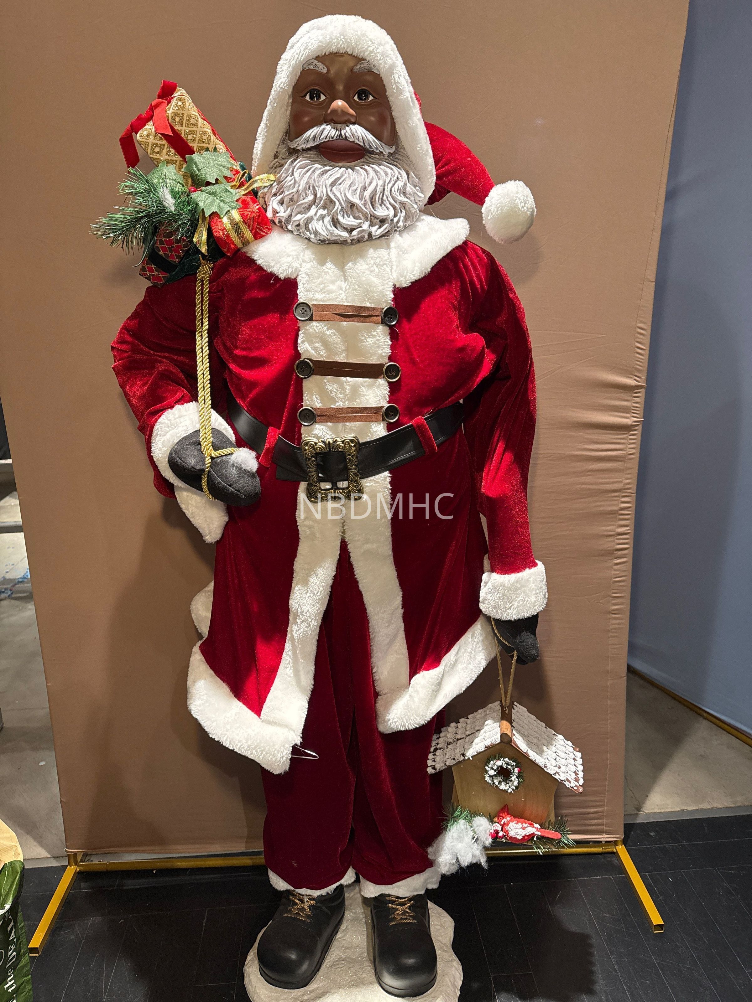 60 inch Santa in red and white holding birdhouse with cardinal in left hand and gold rope to green bag of gifts with holly sprig in right hand. Guinness 688.