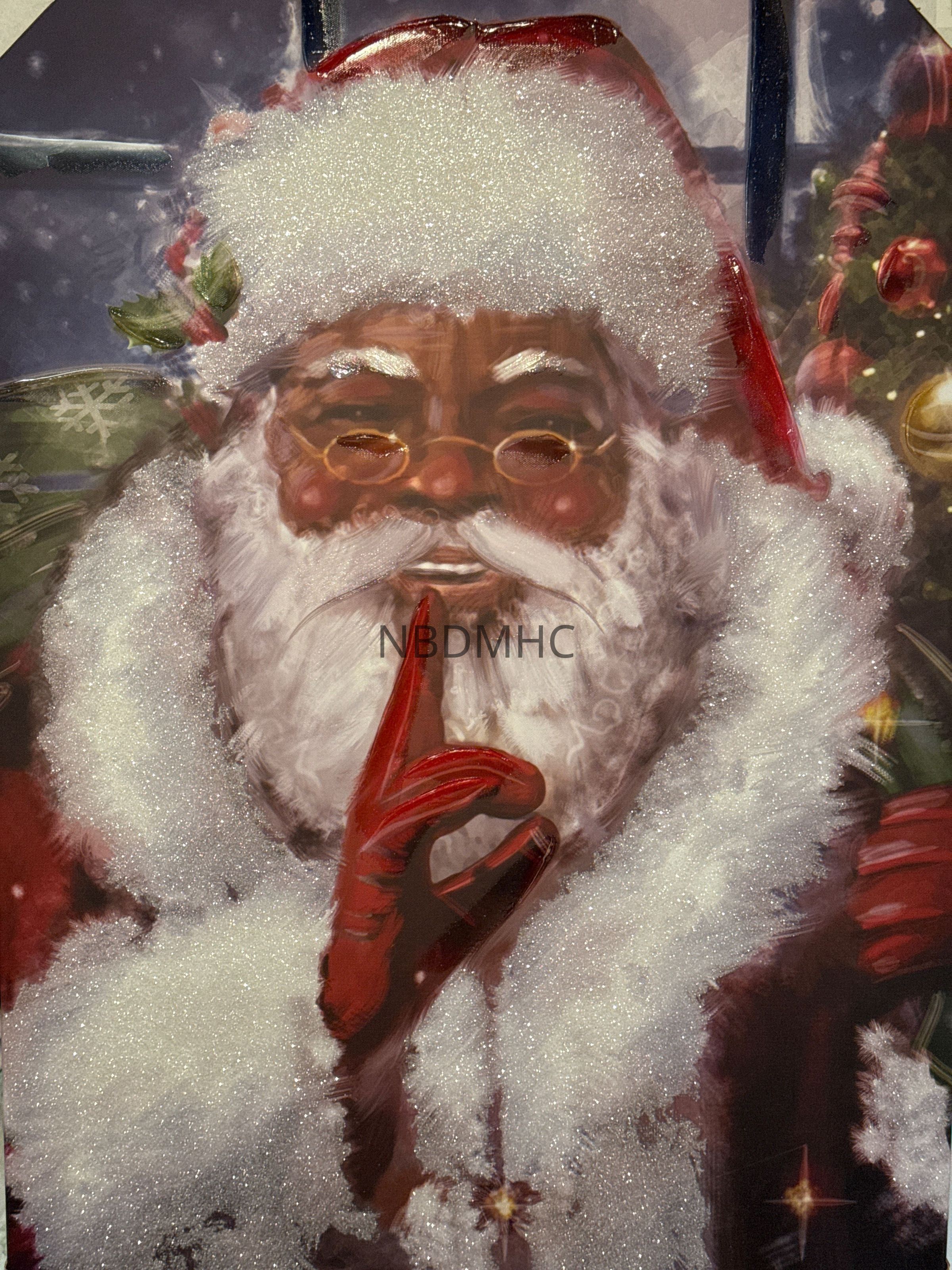 36x24 inch print on canvas of Santa with a red-gloved finger to his lips. Christmas tree in background. Painting enhanced by white sparkles and red paint on the glove. Guinness 645