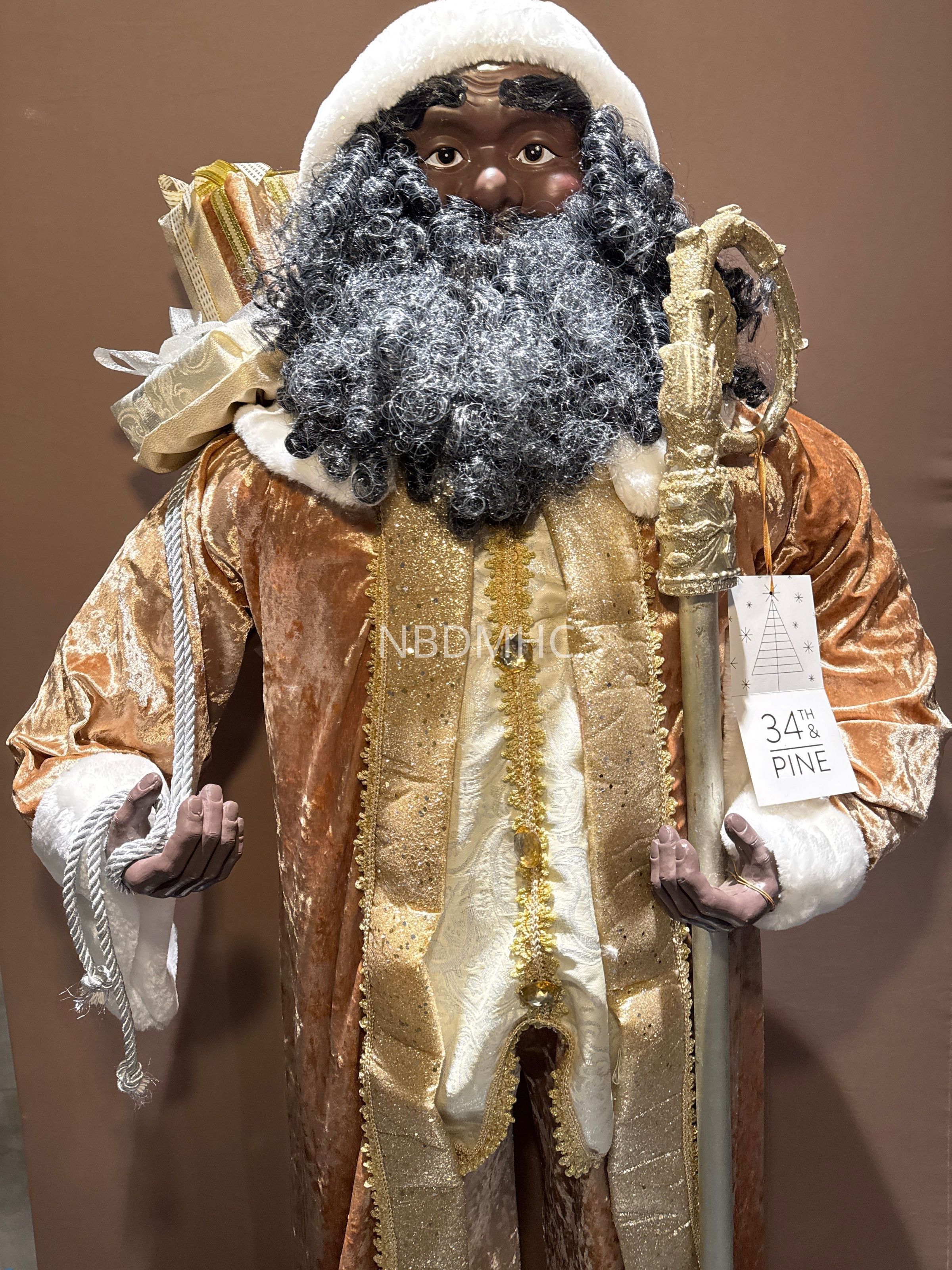 60 inch Santa dressed in tan velvet robe with gold and white fur trim. Holding a gold glitter staff and a silver rope attached to an ivory-gold bag of gifts. Guinness 686.