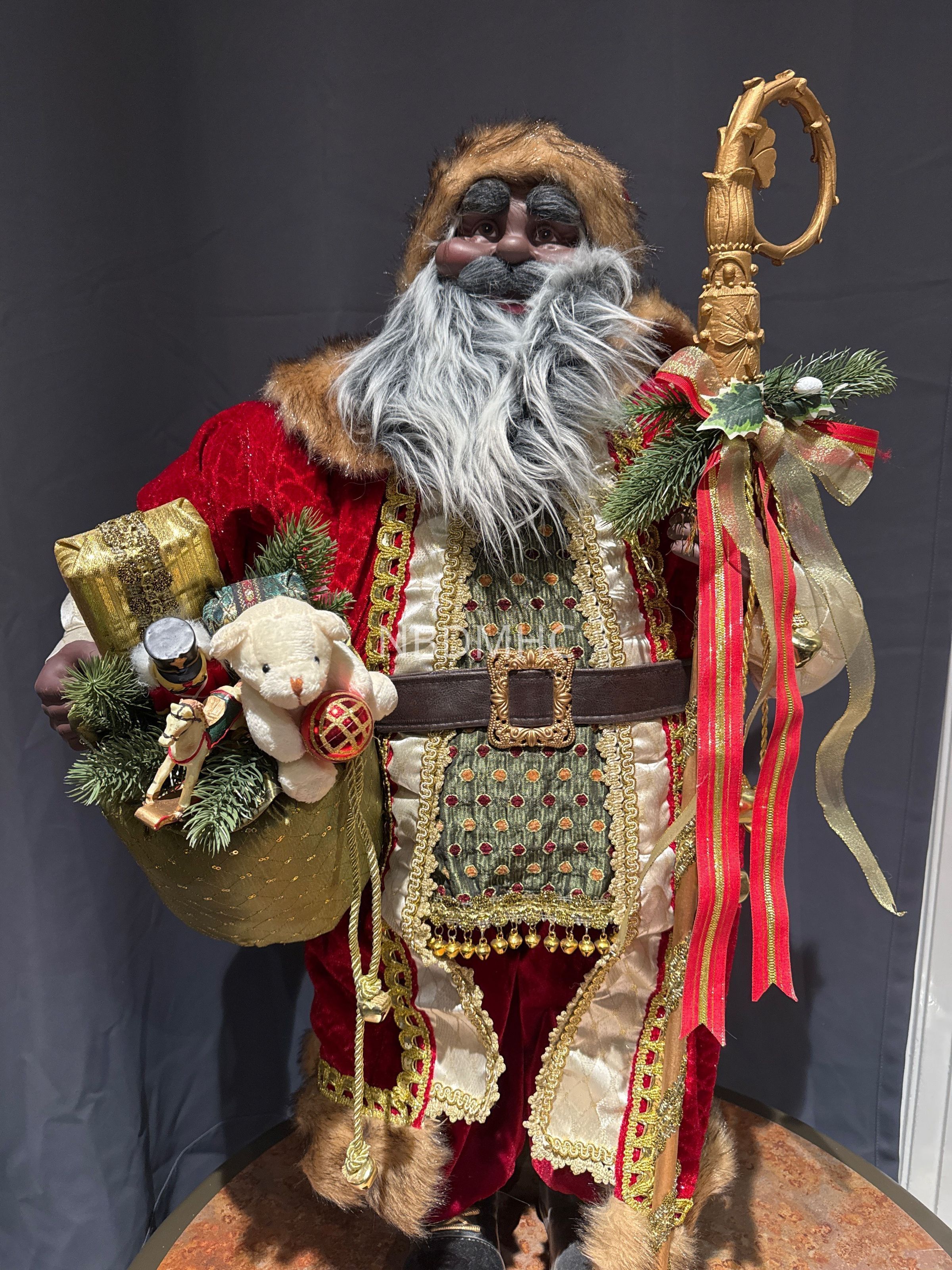 36 inch Santa wearing red velour robe with brown fur, white satin, and gold braid trim. Green front dotted with ruby red and gold. Gold bells hanging from front. Holding gold staff with ribbons and greenery and green satin bag with teddy bear and other gifts. Guinness 663.