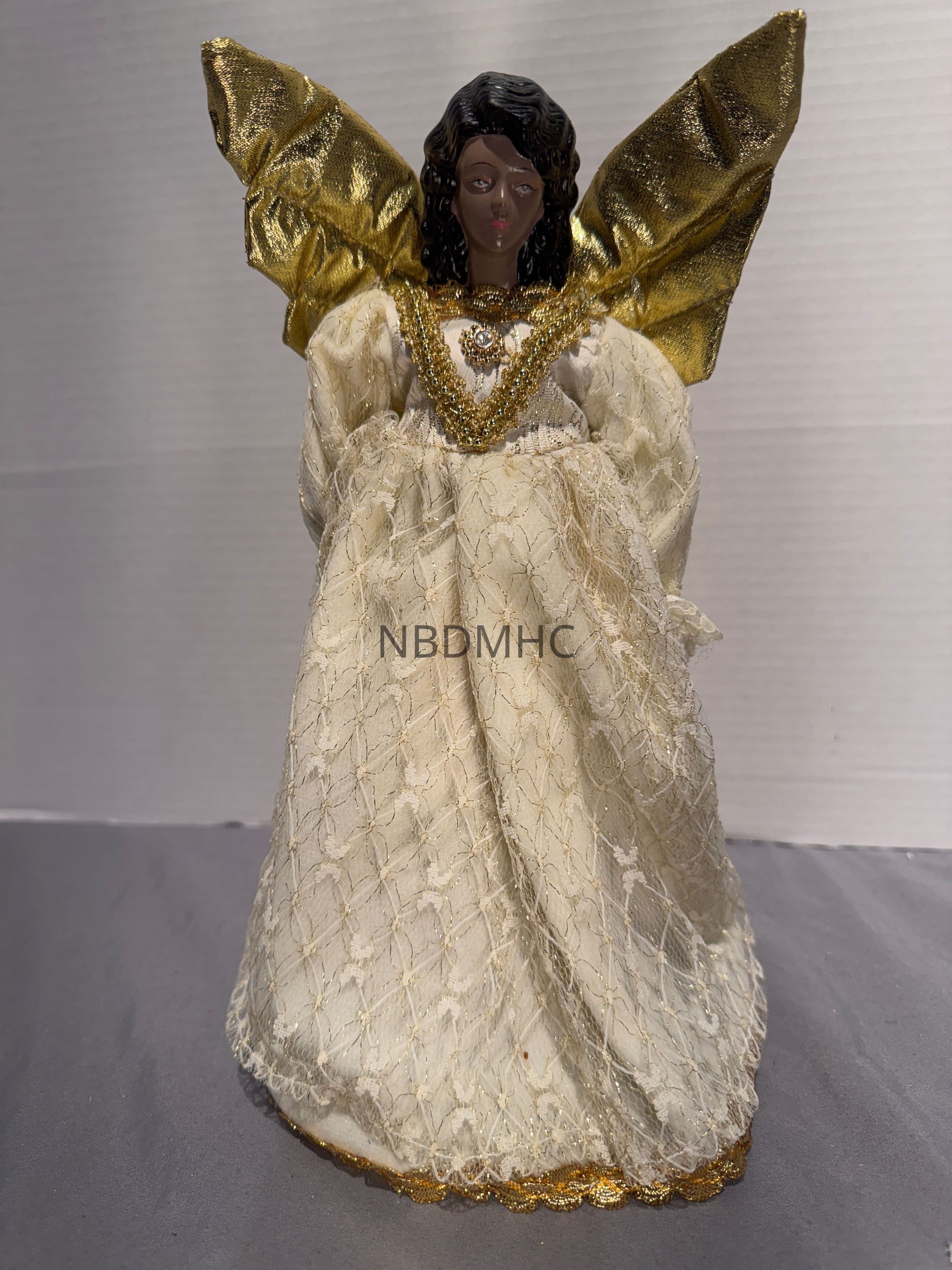 12 inch angel tree-topper with gold wings. Ivory dress has ivory and gold mesh overlay. Gold braid at the neck and hem, V of gold on bodice with jewel in center. Guinness 252