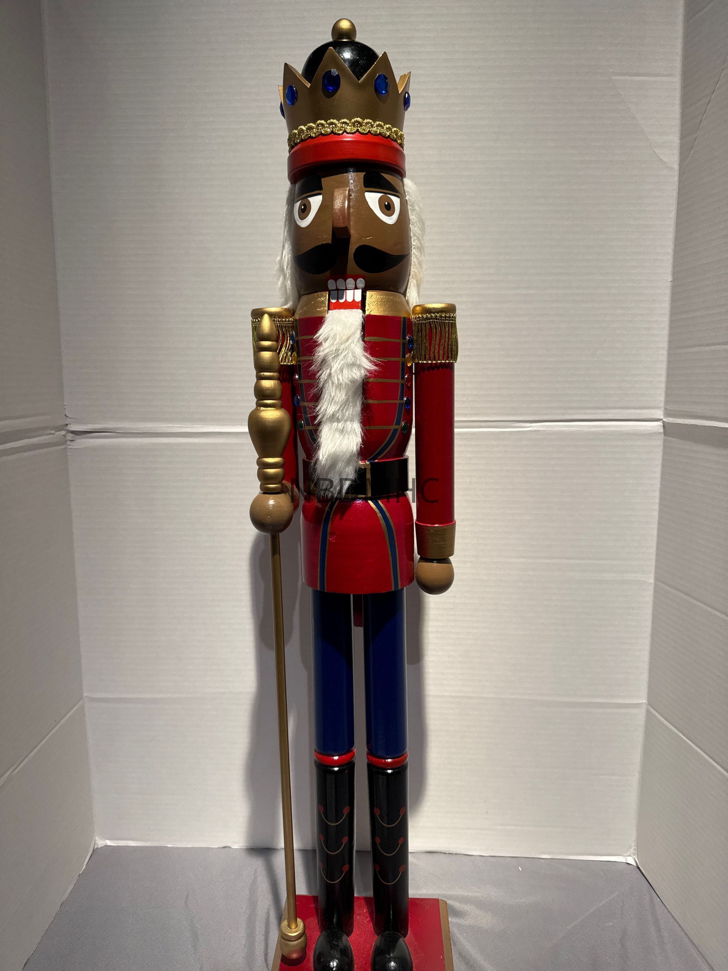 32 inch nutcracker, red and gold crown with black dome, blue jewels, and gold braid. White hair and beard with black painted on mustache. Gold epaulettes, red jacket, multicolor jeweled buttons down sides of chest, black belt. Blue pants, black boots, holding gold staff. Guinness 313.